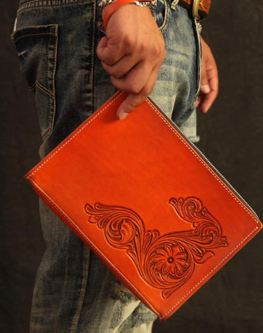 Cool Handmade Tooled Leather Tan Floral Clutch Wallet Wristlet Bag Clutch Purse For Men