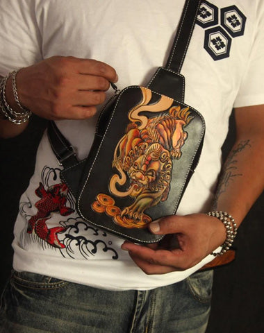 Cool Handmade Tooled Leather Tang Lion Sling Bag Chest Bag One Shoulder Backpack For Men
