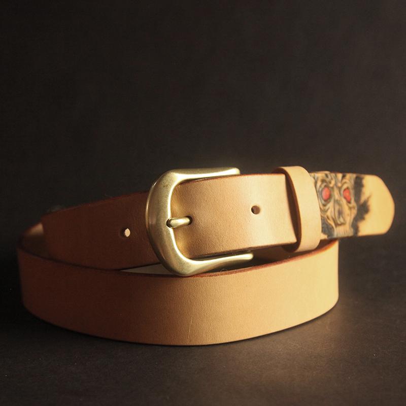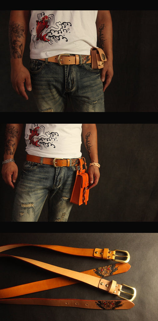 Design: Cool Handmade Yellow Brown Leather Mens Belt Carved Leather Belt for Men