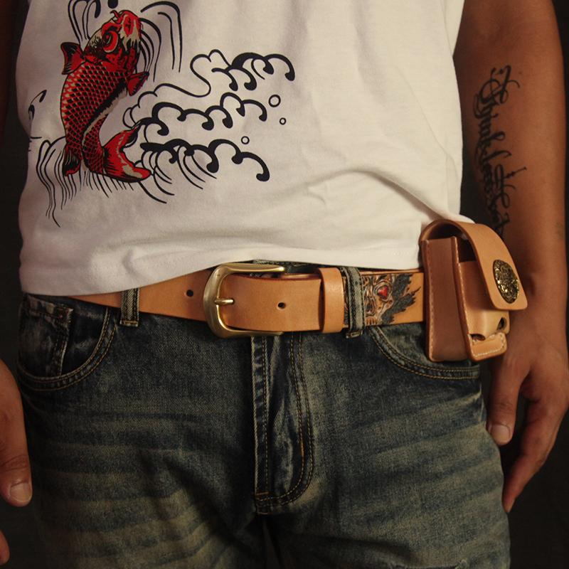 Style: Cool Handmade Yellow Brown Leather Mens Belt Carved Leather Belt for Men