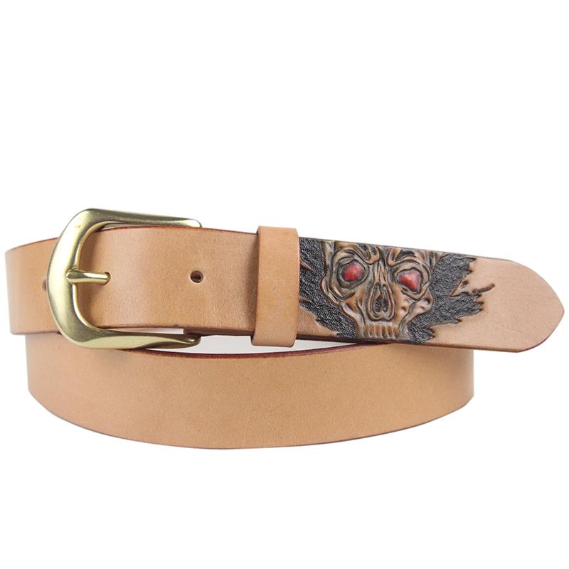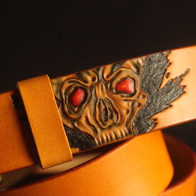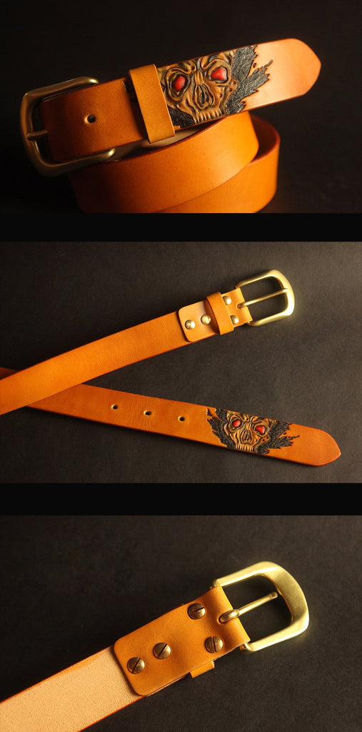 Cool Handmade Yellow Brown Skull Tooled Leather Mens Belt Carved Leather Belt for Men