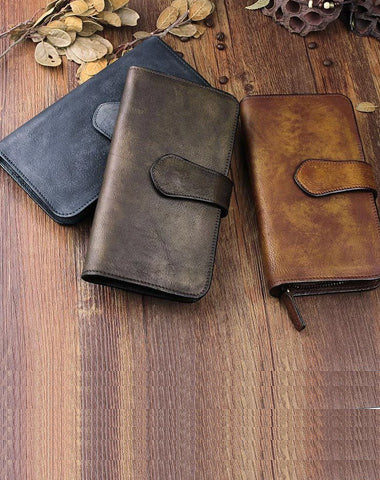 Style: Cool Leather Brown Mens Long Wallet Dark Gray Buckled Long Wallet Trifold Clutch Multi-function Wallet for Men