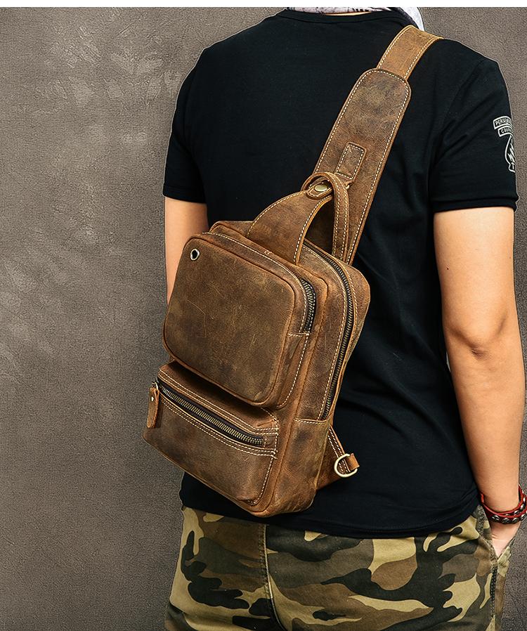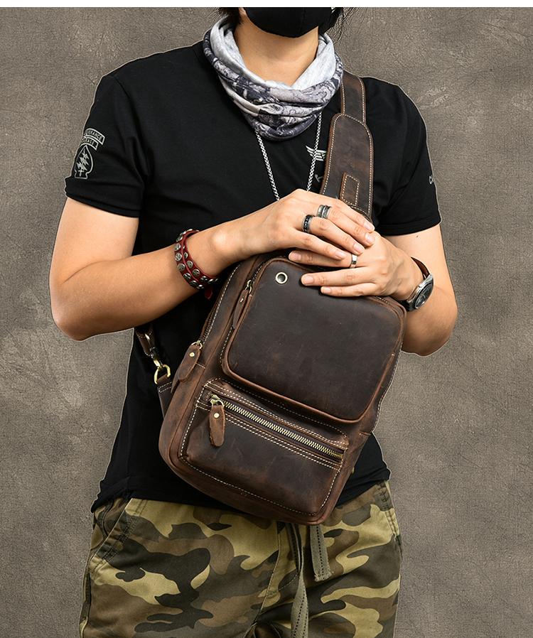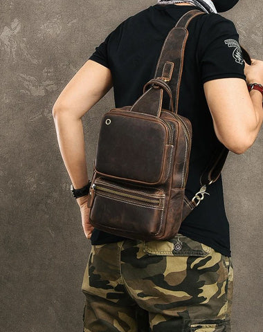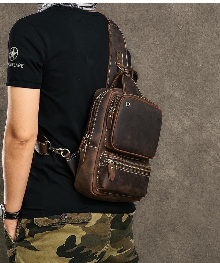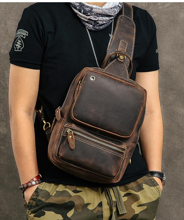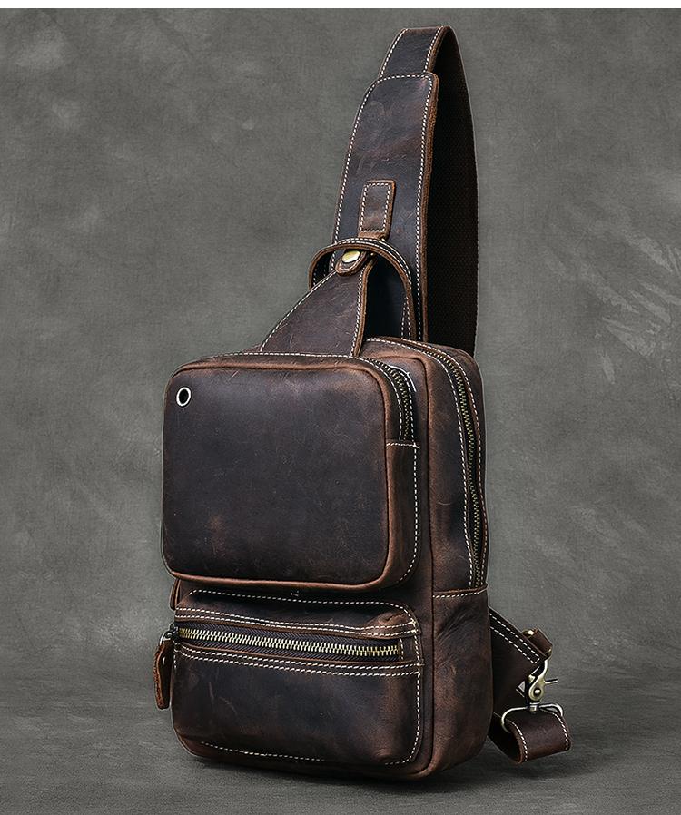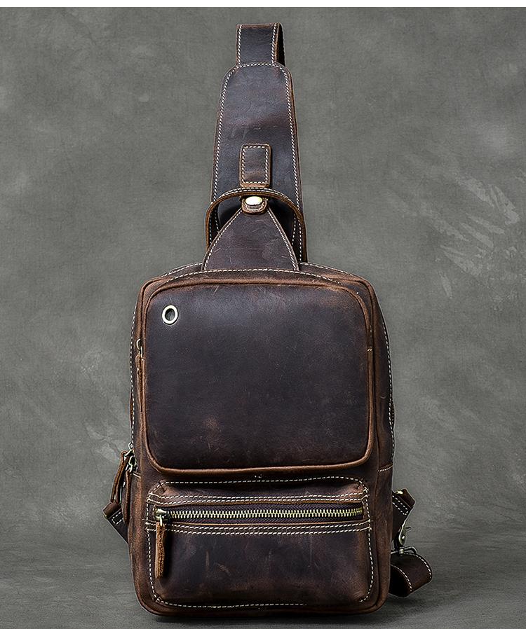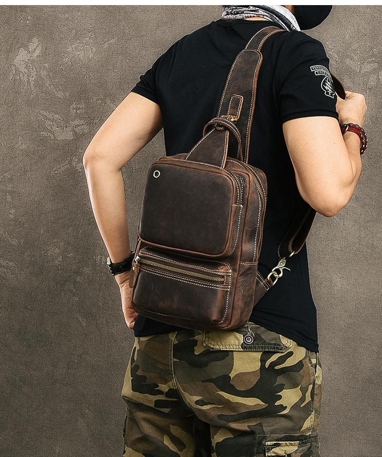 Design: Cool Leather Mens 10" Brown Chest Bag Dark Coffee Travel Backpack College Backpack for Men
