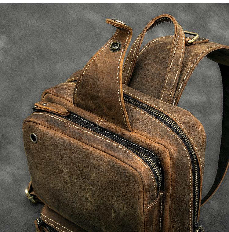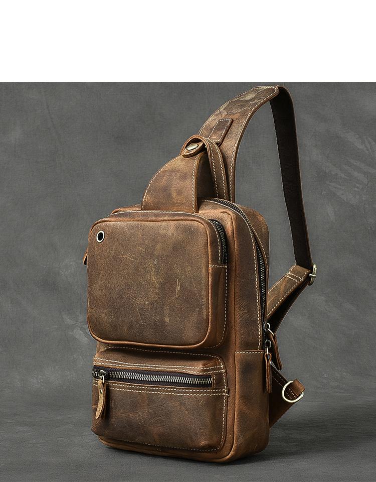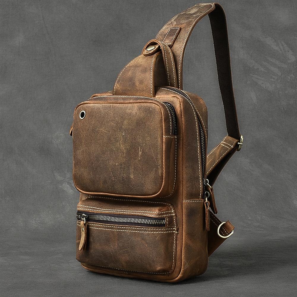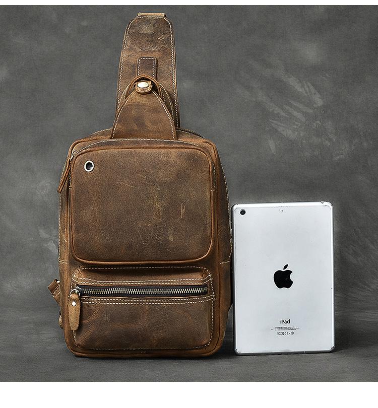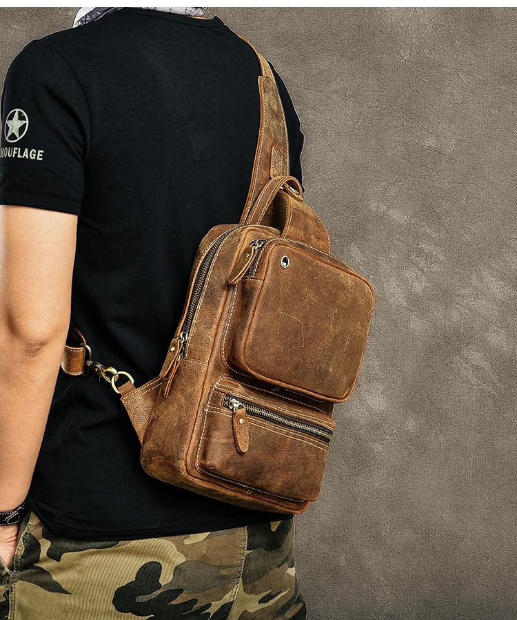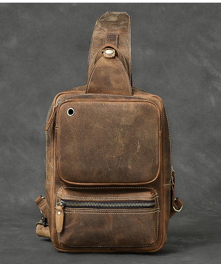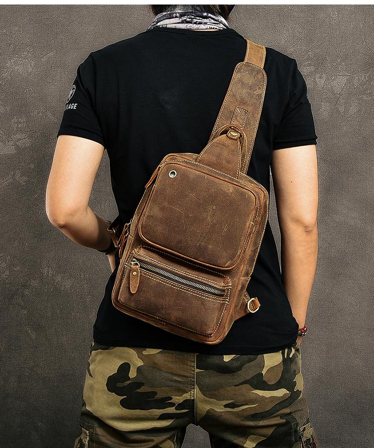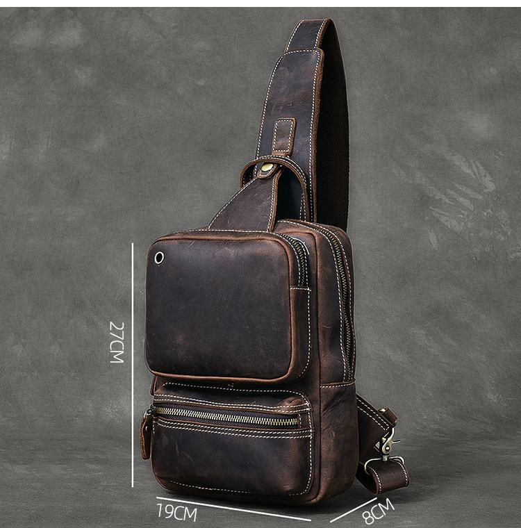 Design: Cool Leather Mens 10" Brown Chest Bag Dark Coffee Travel Backpack College Backpack for Men