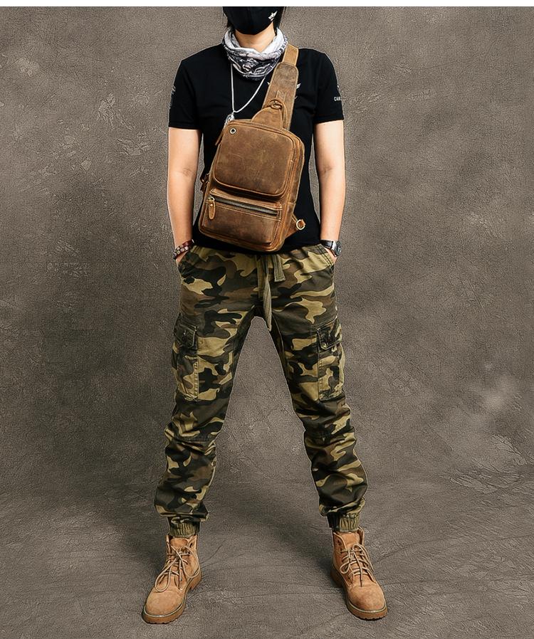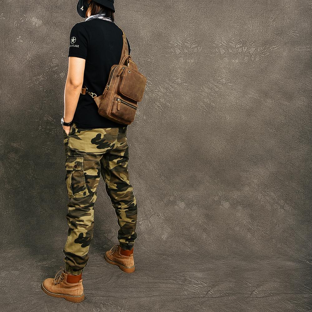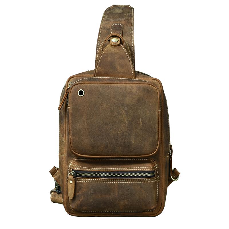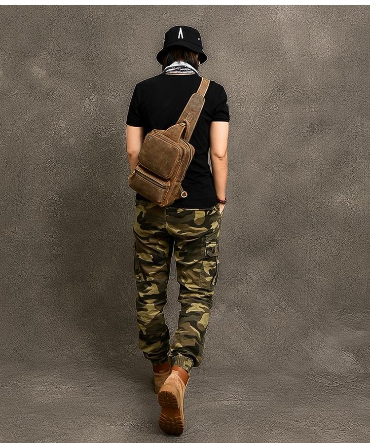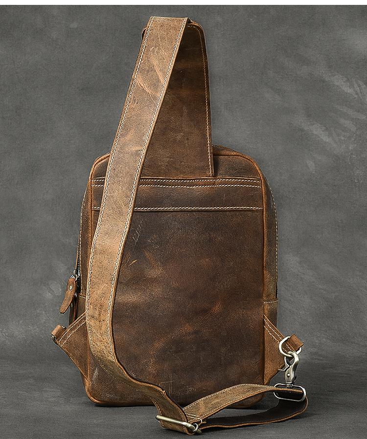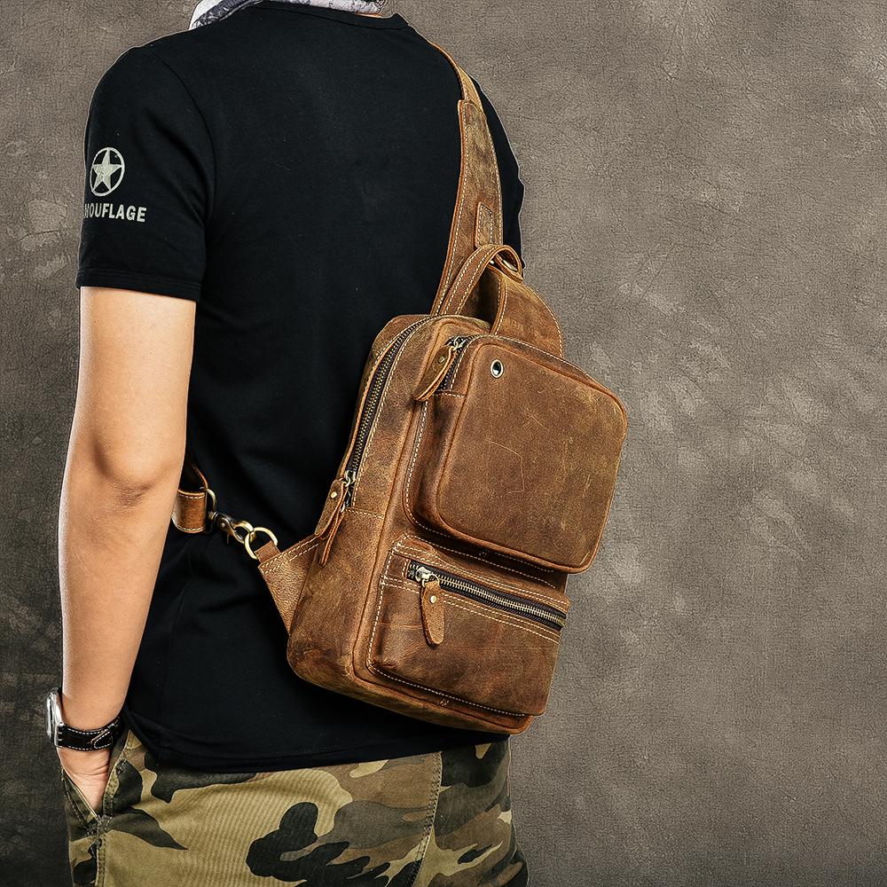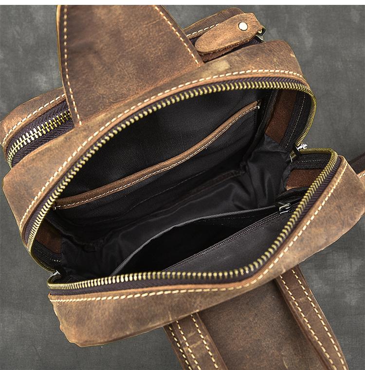 Design: Cool Leather Mens 10" Brown Chest Bag Dark Coffee Travel Backpack College Backpack for Men