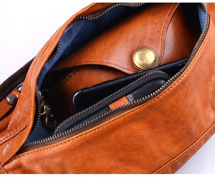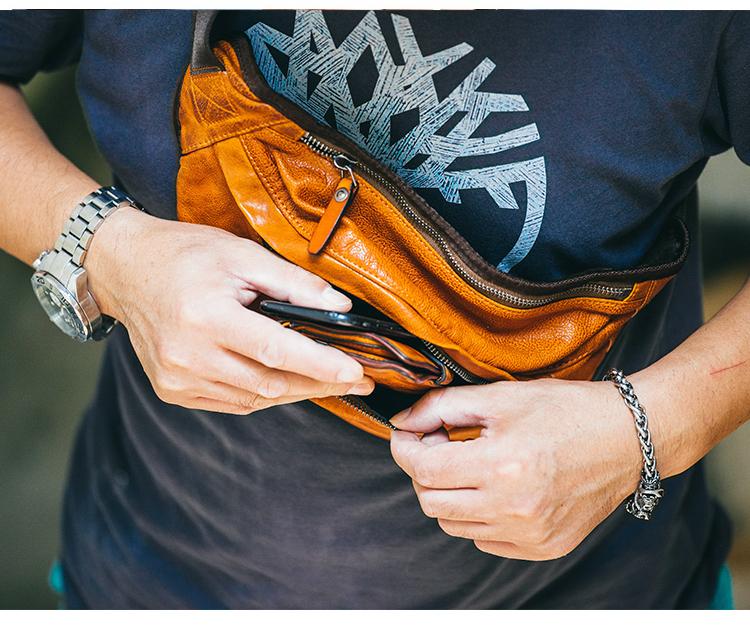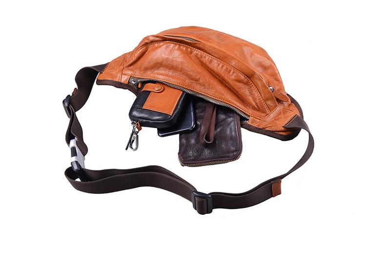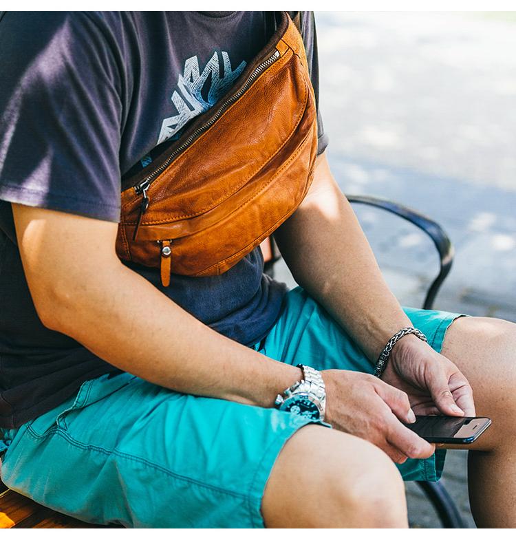 Design: Cool Light Brown Leather Men Chest Bag Waist Bags Tan Fanny Pack Hip Bag Bum Pack For Men