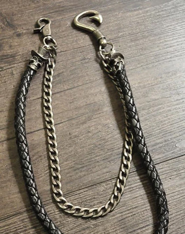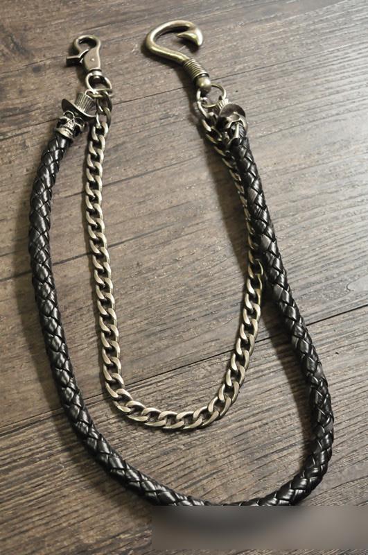 Design: Cool Men's Black Braided Leather Double Skull Pants Chain Wallet Chain For Men