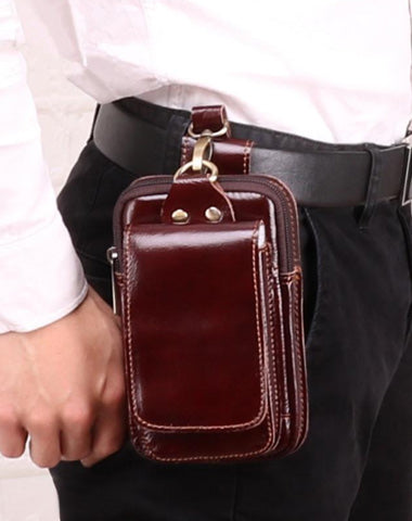 Design: Cool Red Brown Oil Waxed Leather Mens Belt Case Belt Pouch Mini Waist Pouch Belt Bags For Men