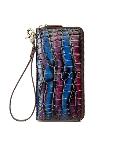 Crocodile Pattern Blue&Purple Leather Wristlet Wallet Womens Zip Around Wallets CONTRAST COLOR Ladies Zipper Clutch Wallets for Women