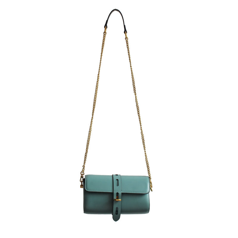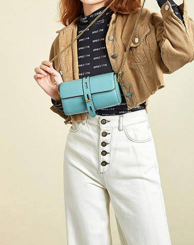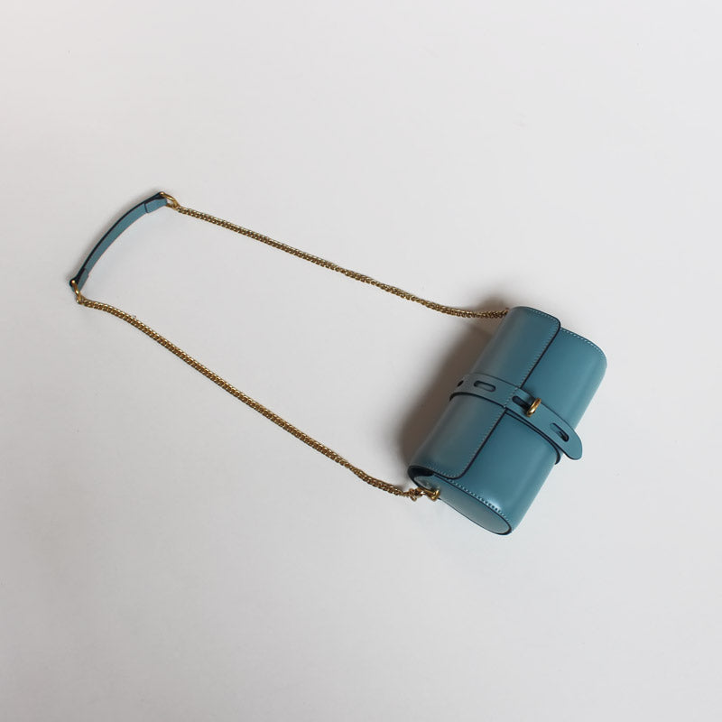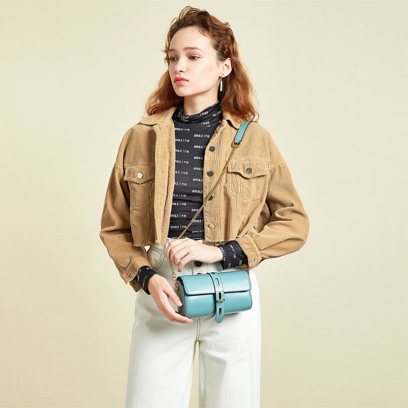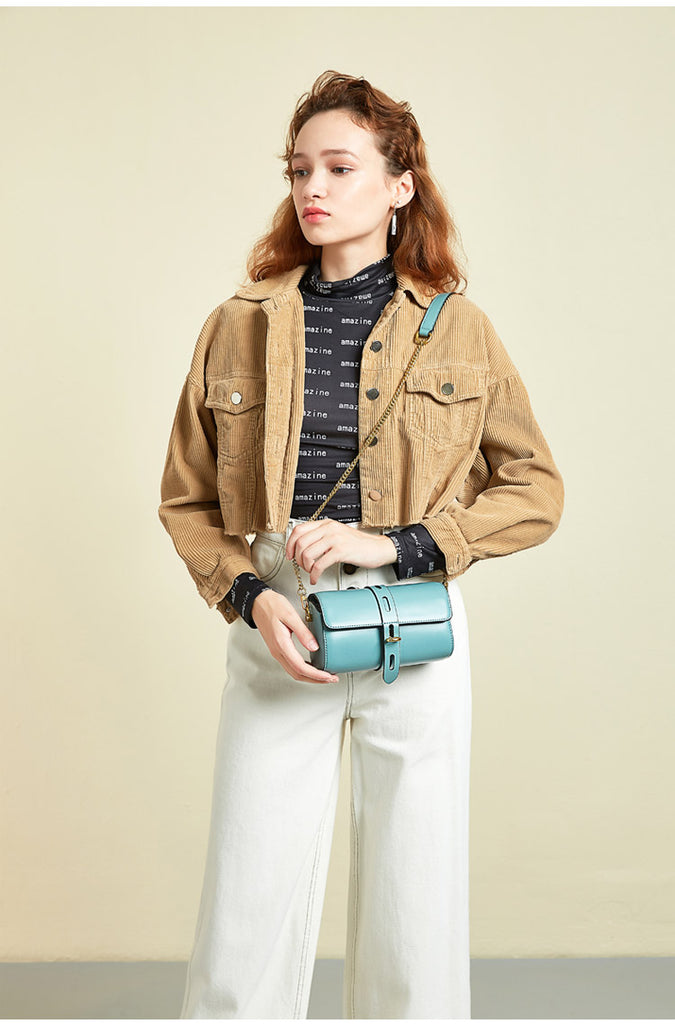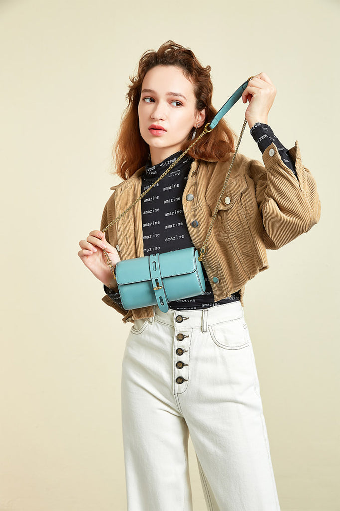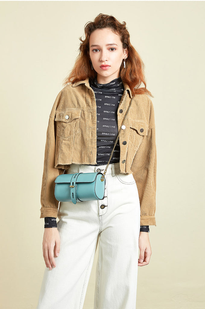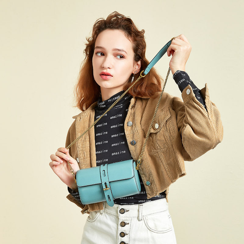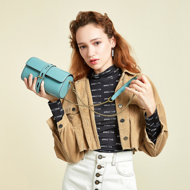 Design: Cute Womens Blue Leather Barrel Crossbody Purse Bucket Round Chain Shoulder Bag for Women
