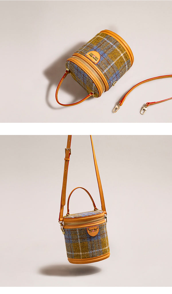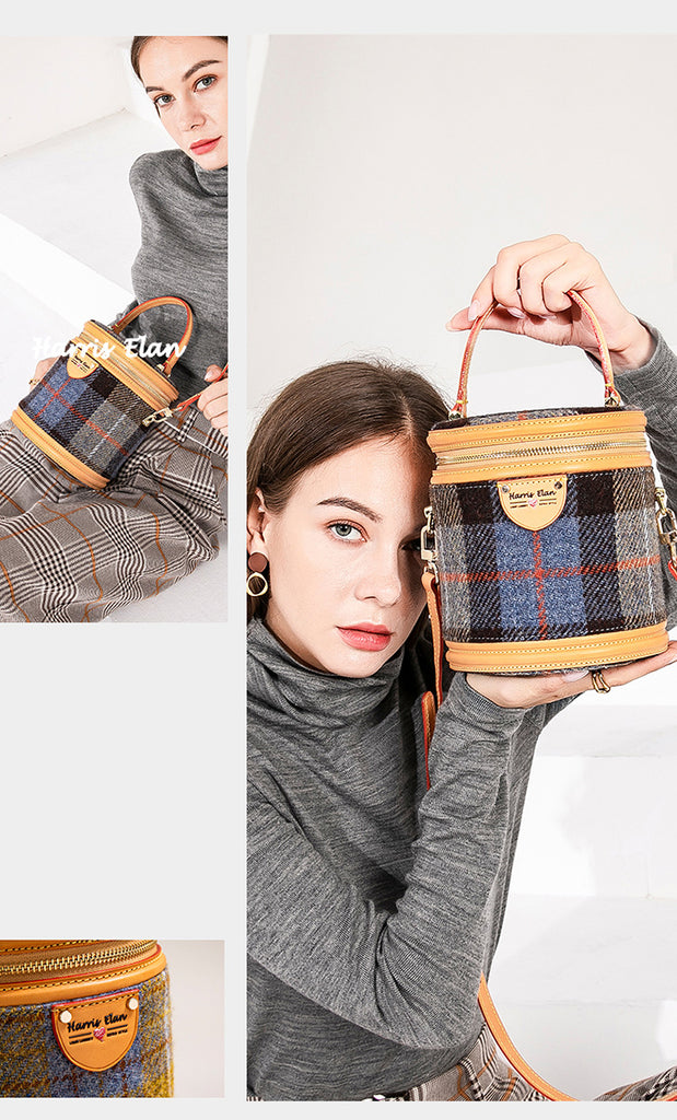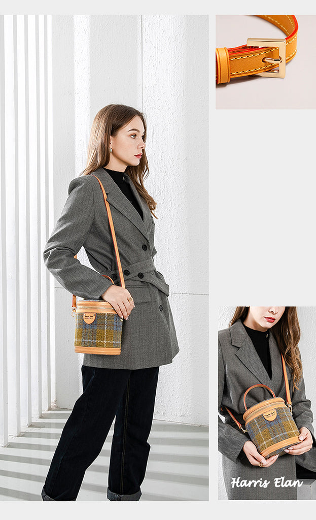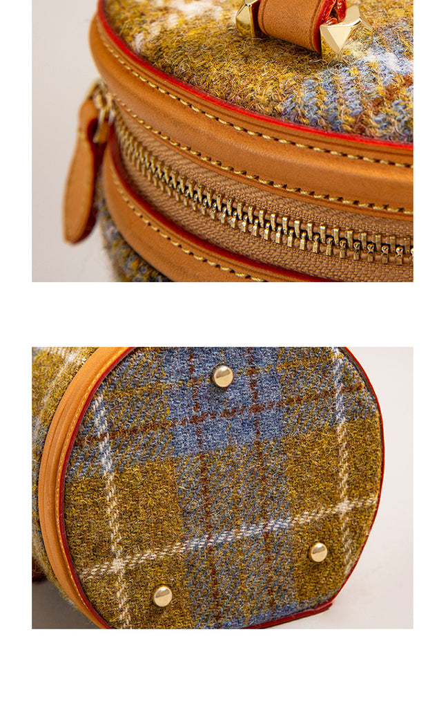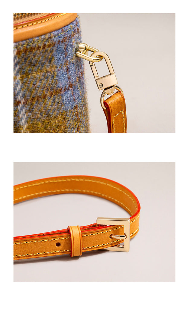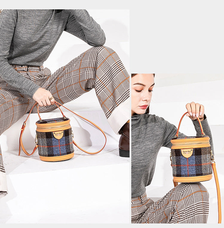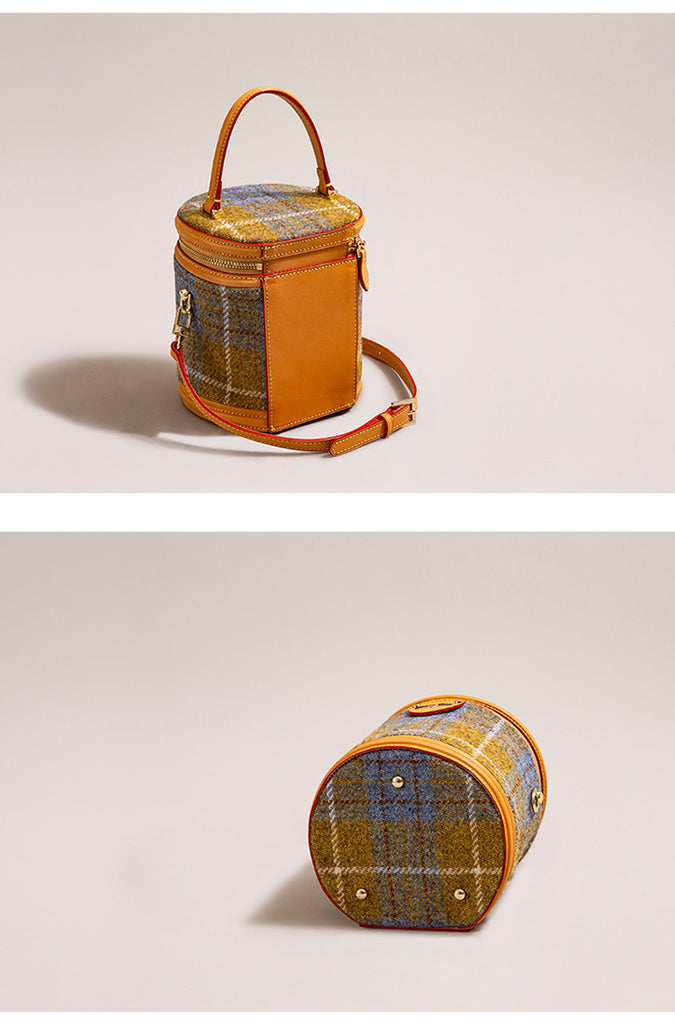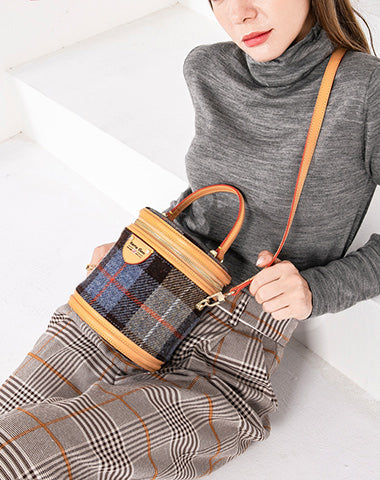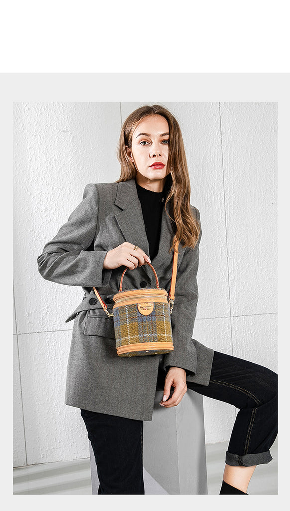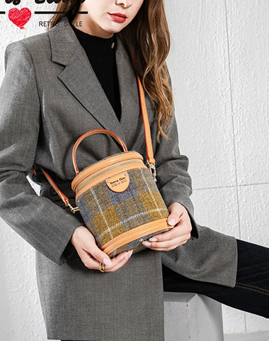 Design: Cute Womens Black Leather Tweed Bucket Handbag Barrel Crossbody Purse Handmade Round Shoulder Bag for Women