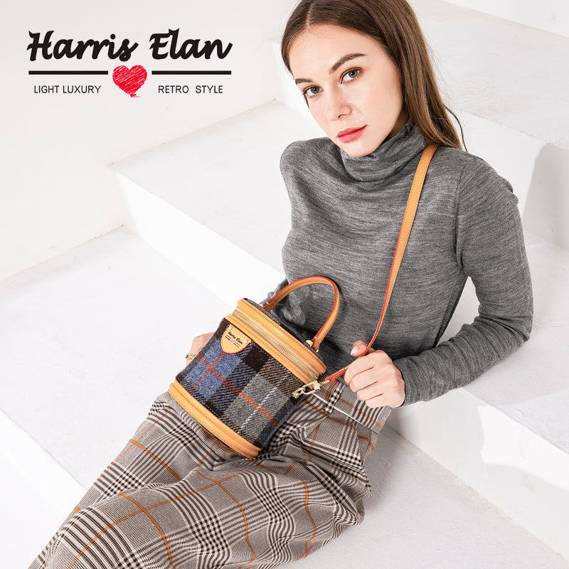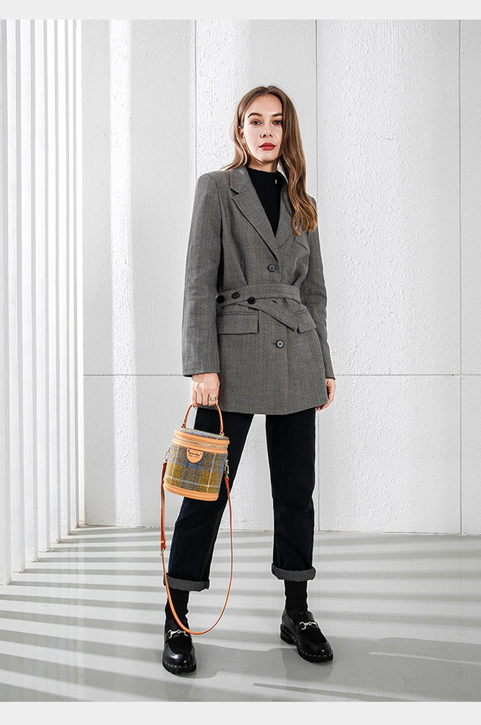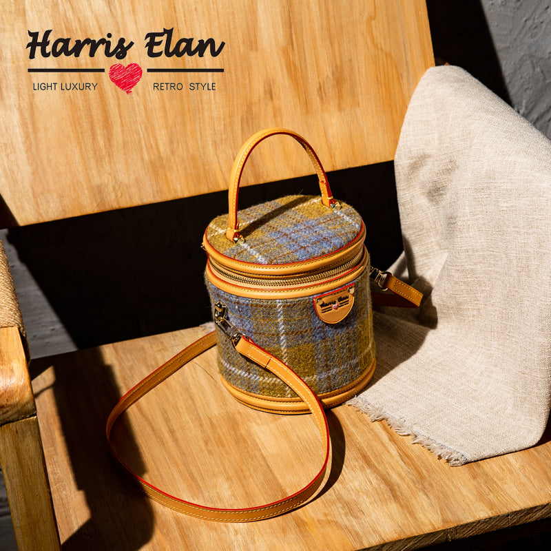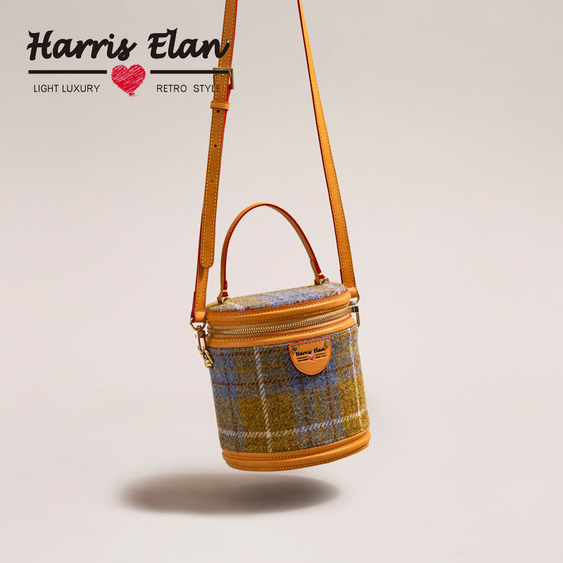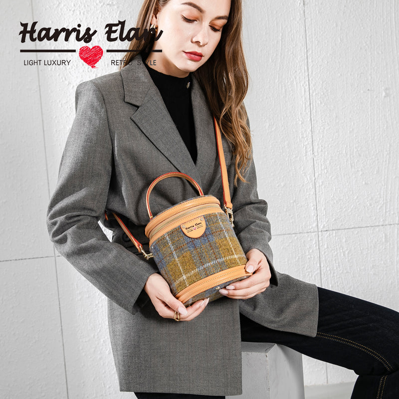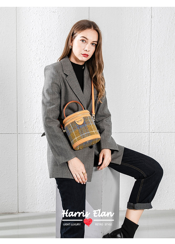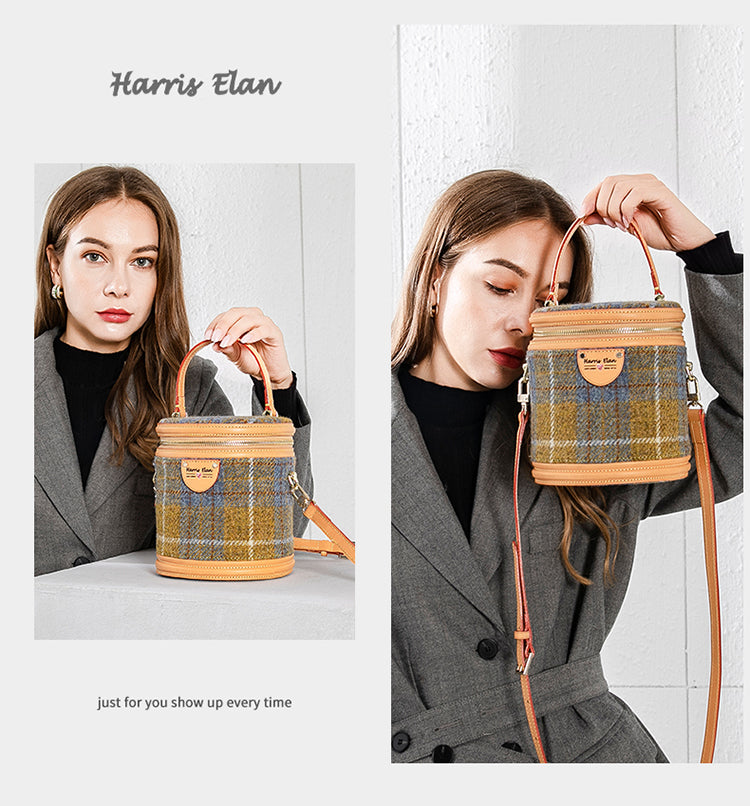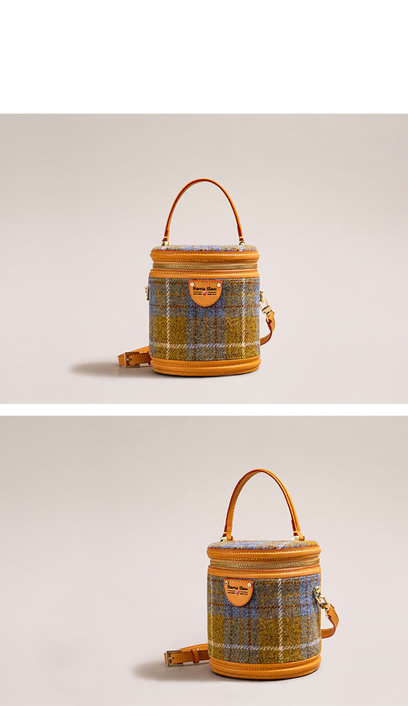 Design: Cute Womens Black Leather Tweed Bucket Handbag Barrel Crossbody Purse Handmade Round Shoulder Bag for Women