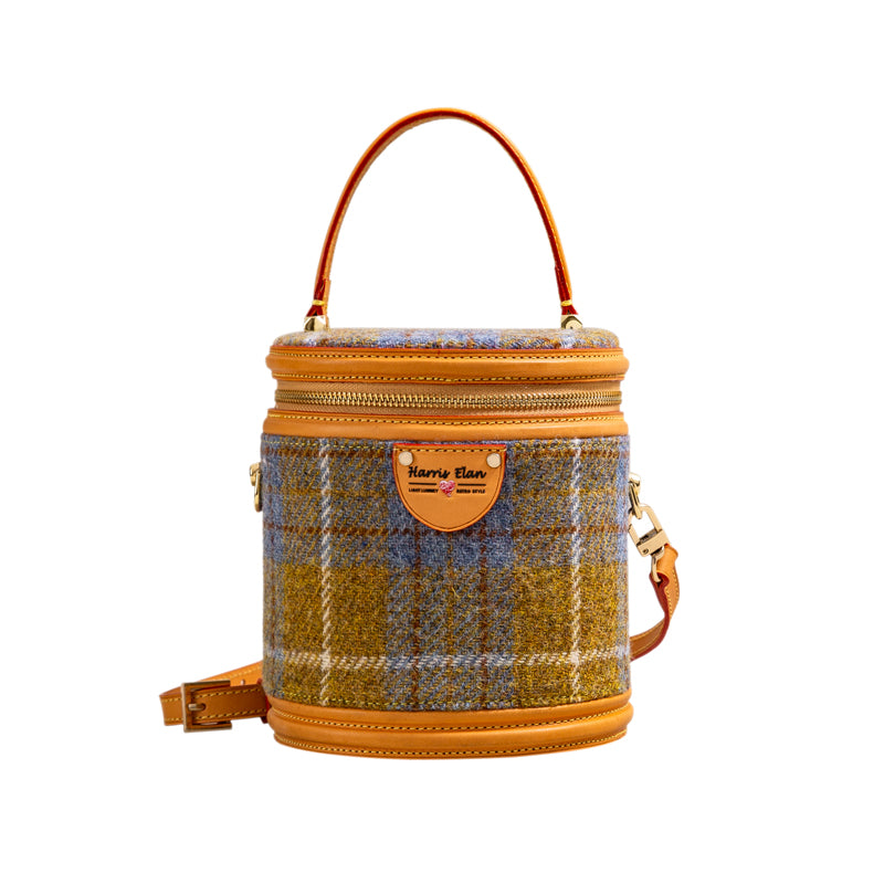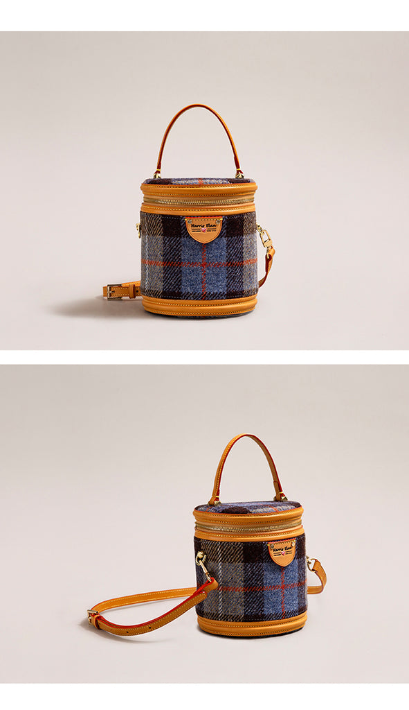 Cute Womens Blue Leather Tweed Bucket Handbag Barrel Crossbody Purse Handmade Round Shoulder Bag for Women