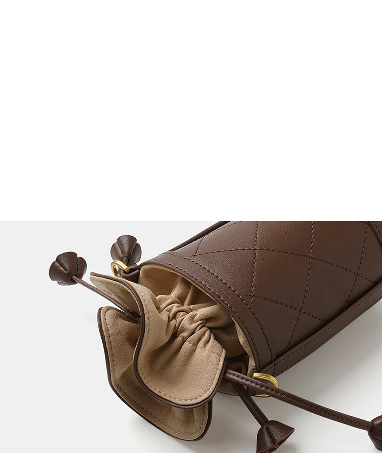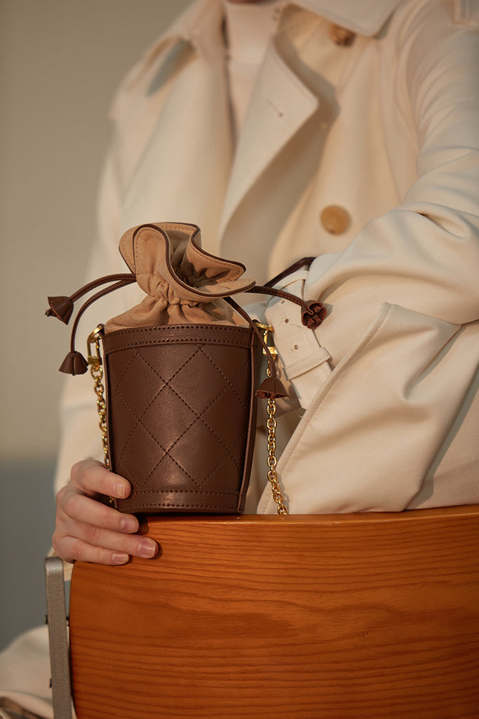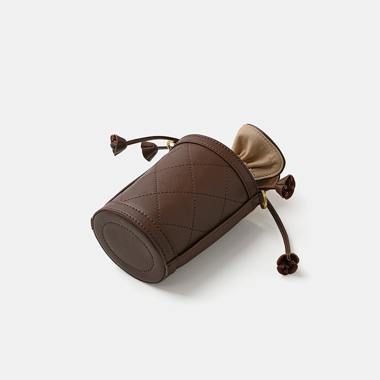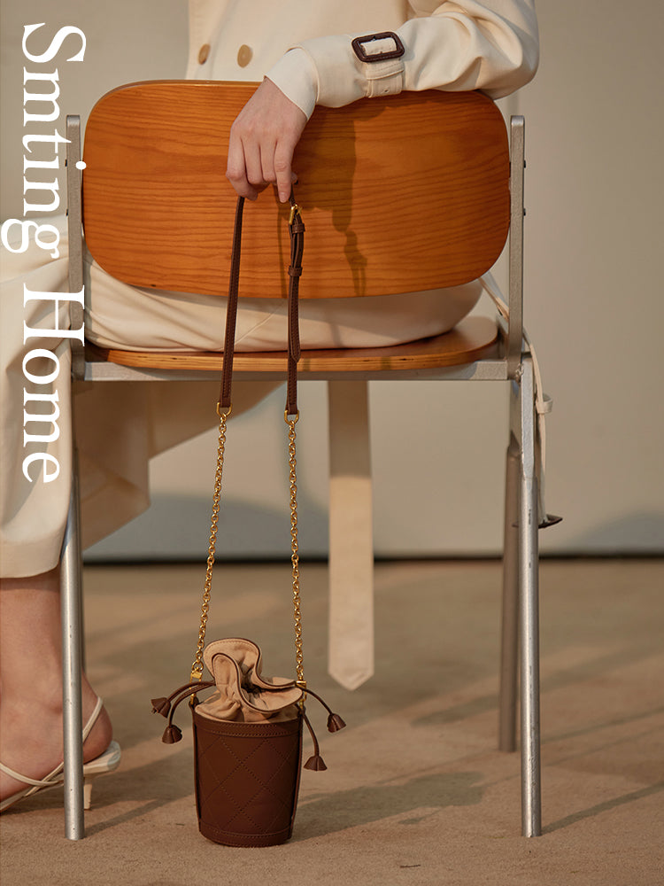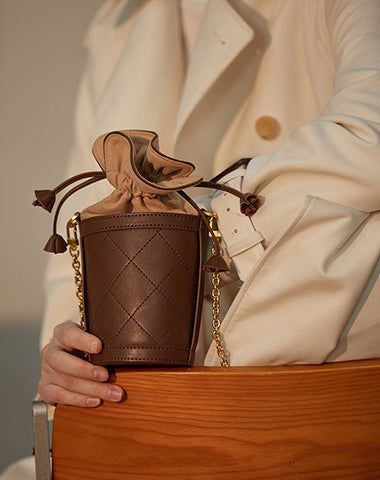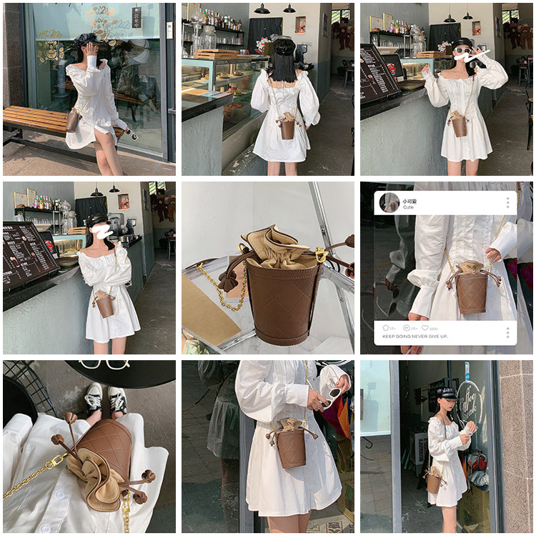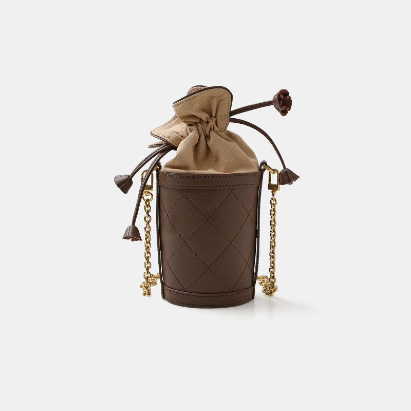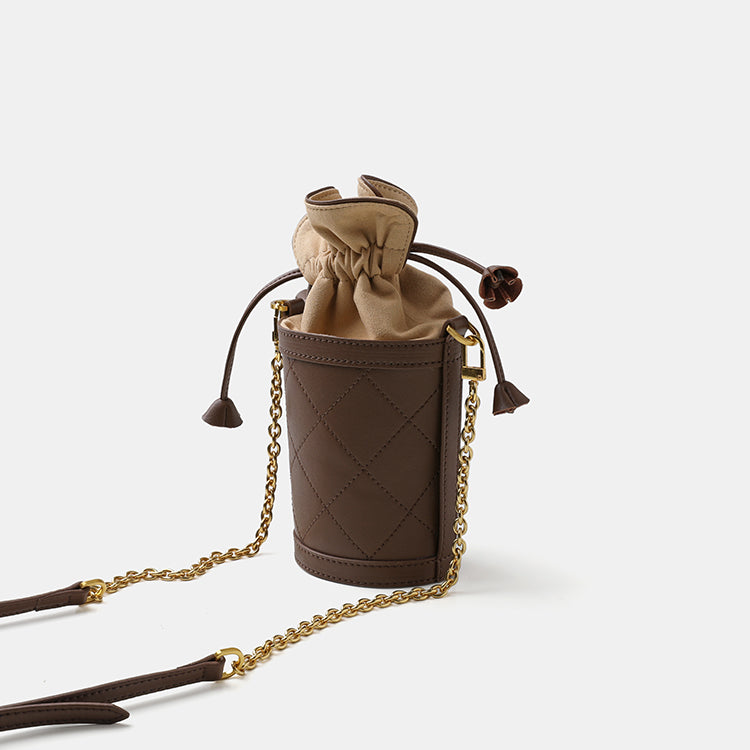 Design: Cute Womens Coffee Leather Barrel Chain Crossbody Purse Bucket Round Shoulder Bag for Women