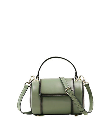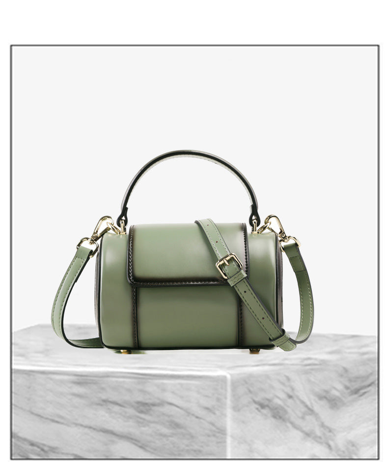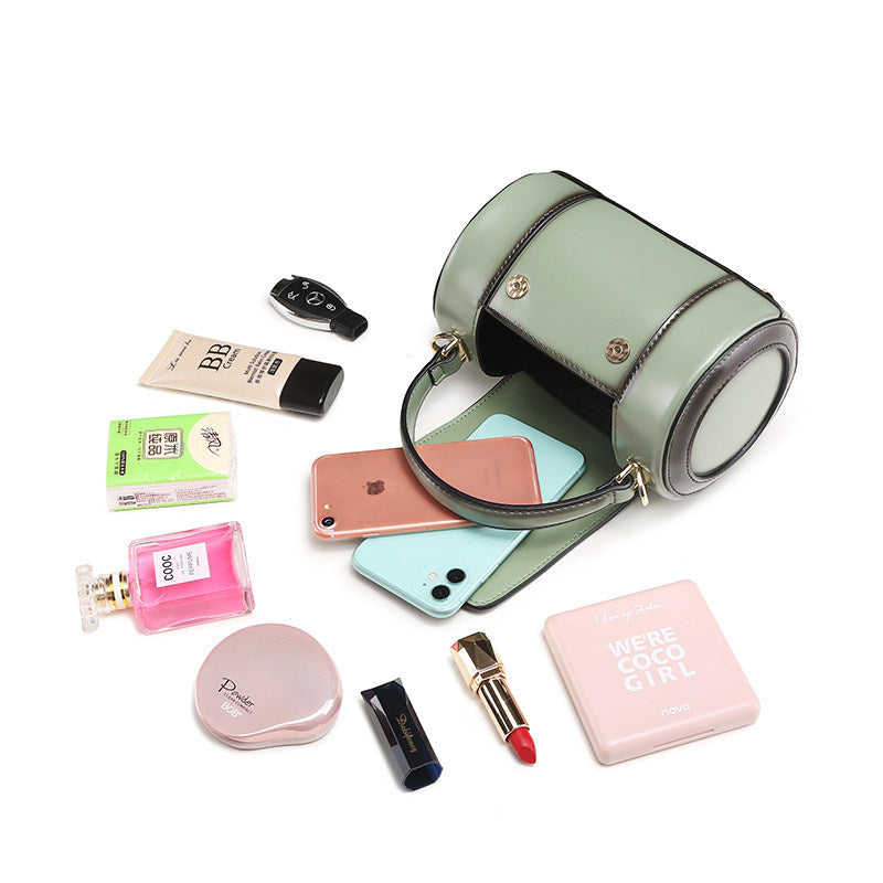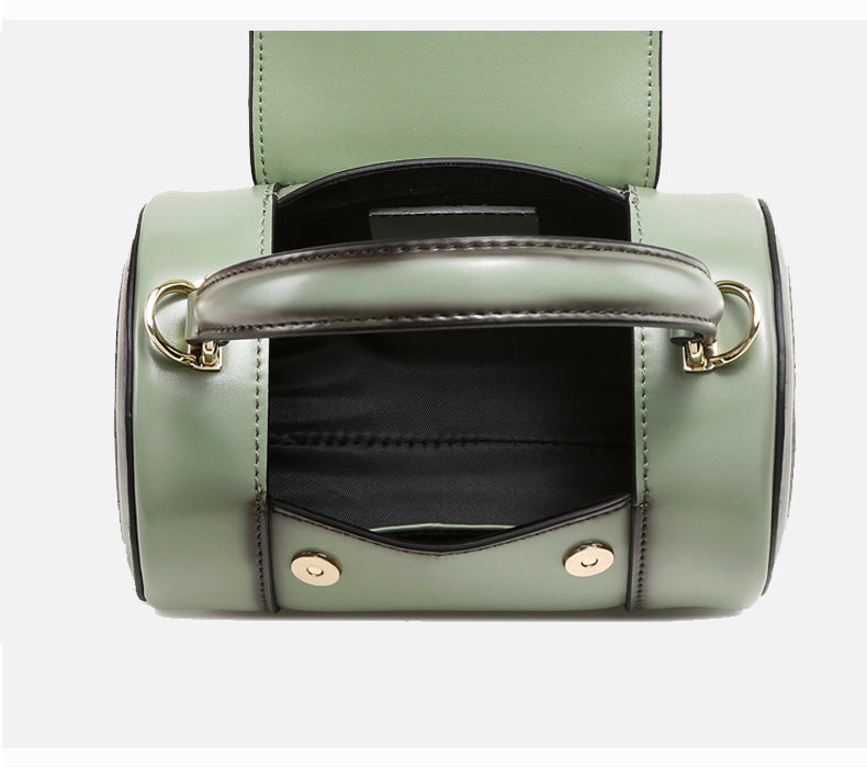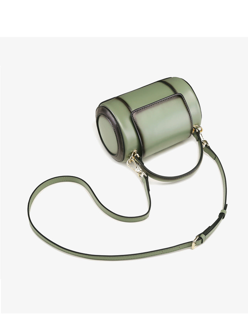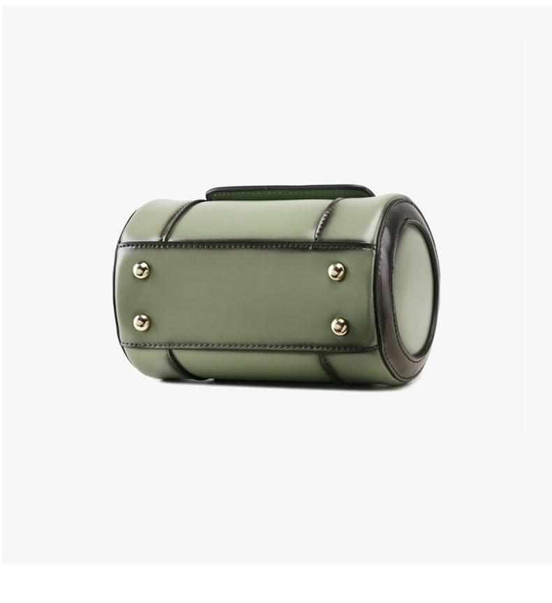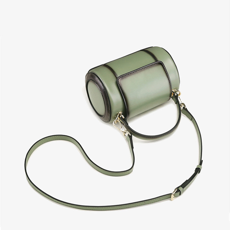 Design: Cute Womens Light Green Leather Barrel Crossbody Purse Round Bucket Handbag Green Shoulder Bag for Women