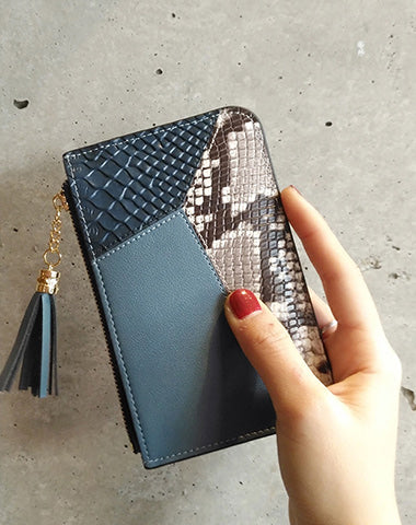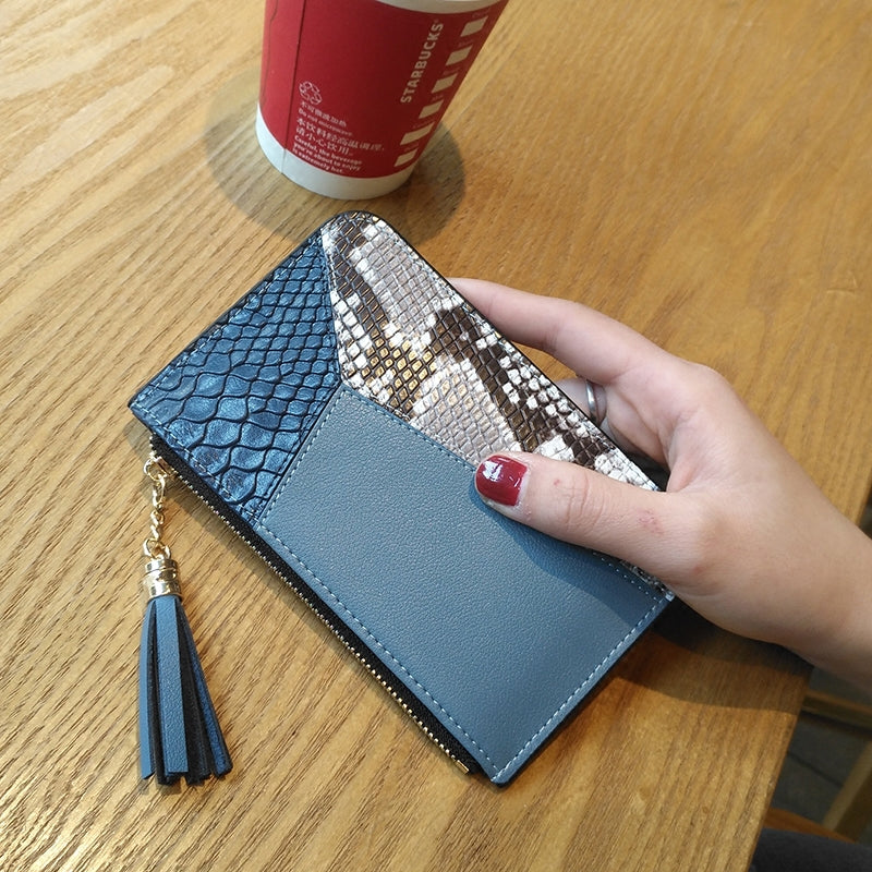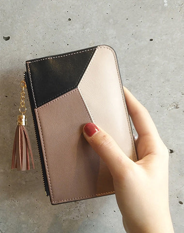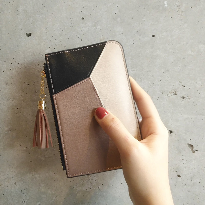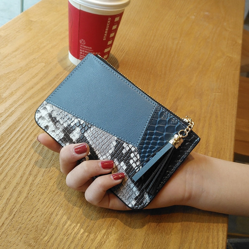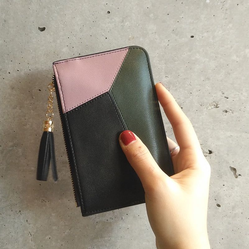 Design: Cute Womens Patchwork Black&Green Leather Card Wallets with Keychain Zip Card Holder Wallet for Women