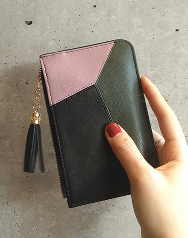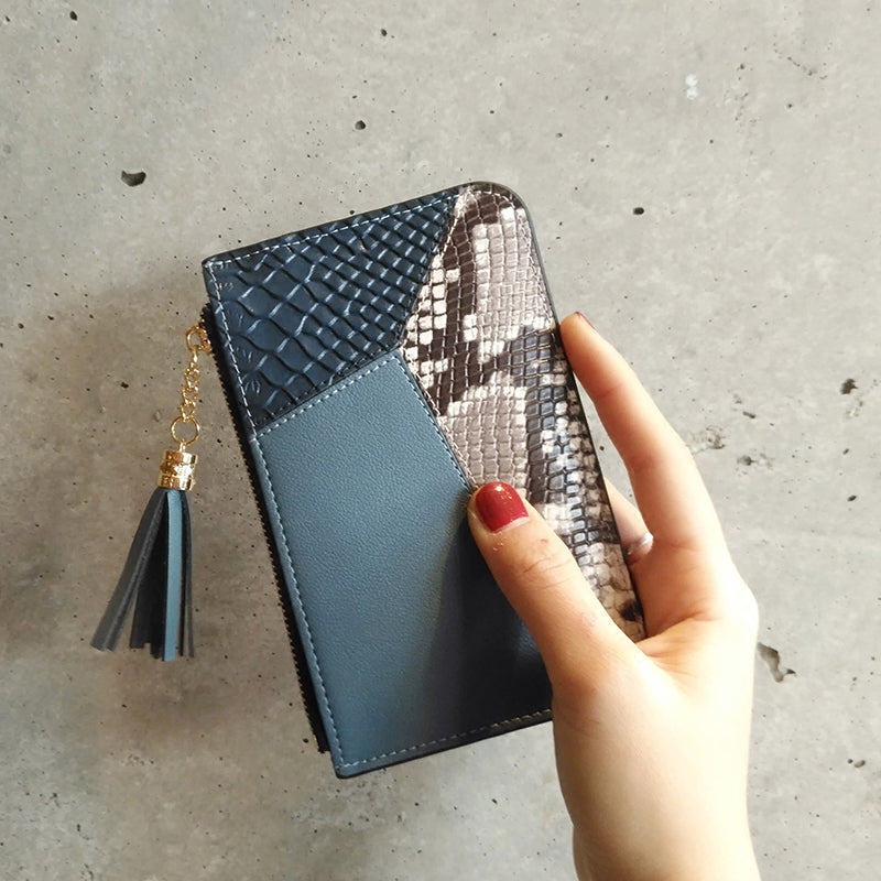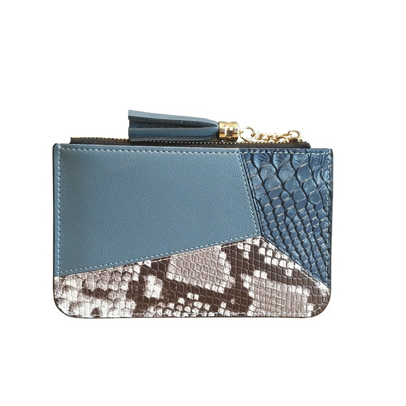 Design: Cute Womens Patchwork Blue Leather Card Wallets with Keychain Zip Card Holder Wallet for Women