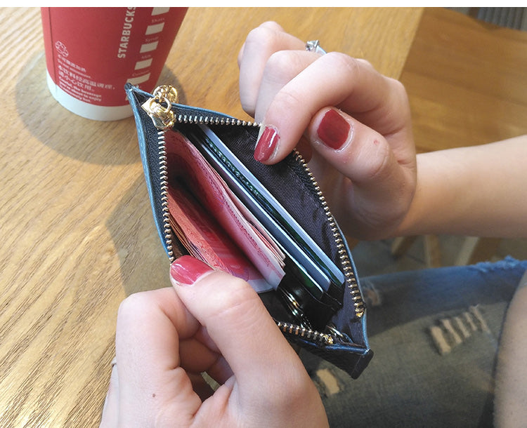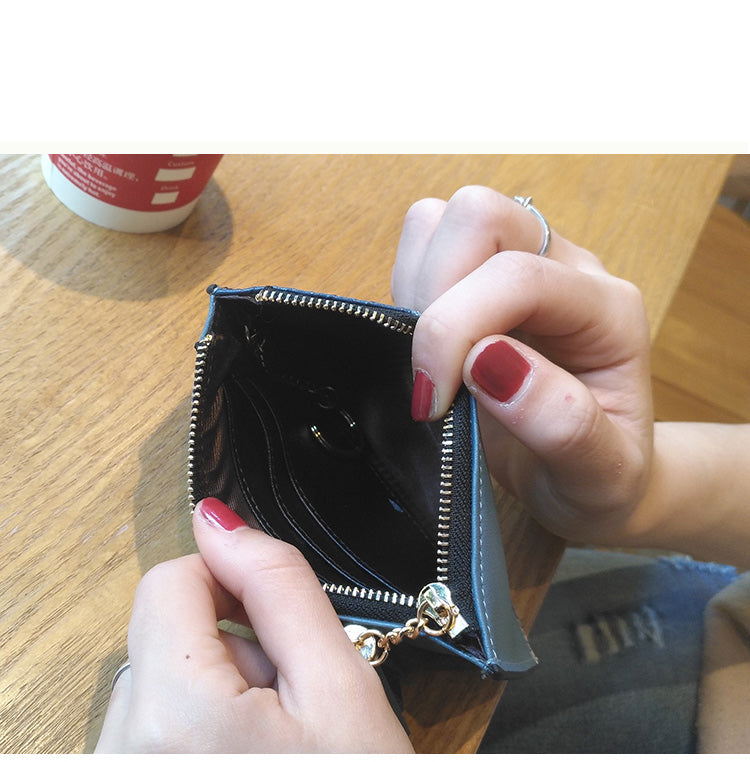 Cute Womens Patchwork Blue Leather Card Wallets with Keychain Zip Card Holder Wallet for Women