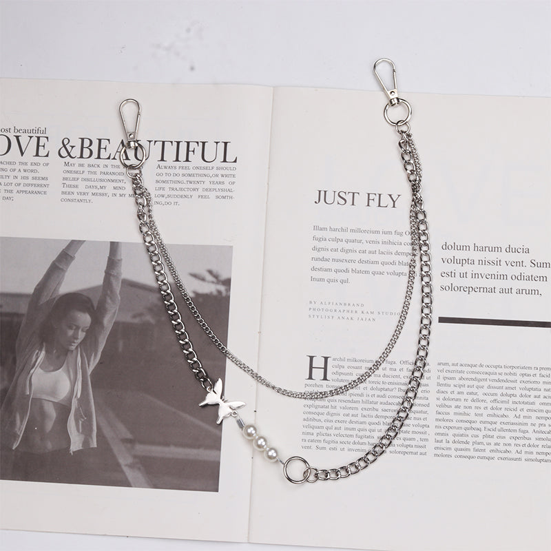 Cute Womens Pearls&Butterfly Jeans Chain Silver Double Layers Astronaut Wallet Chains Jeans Chain For Women