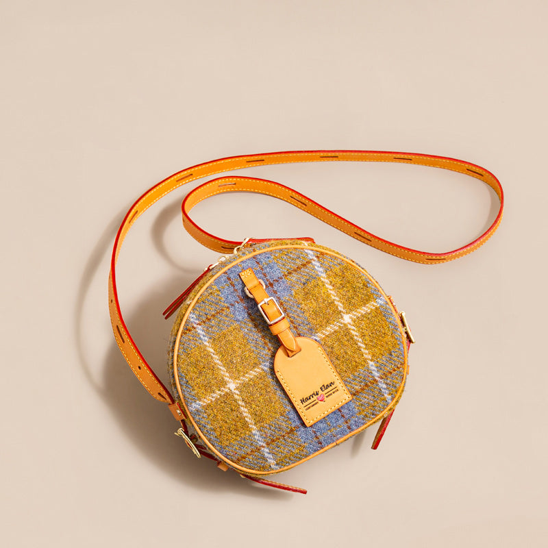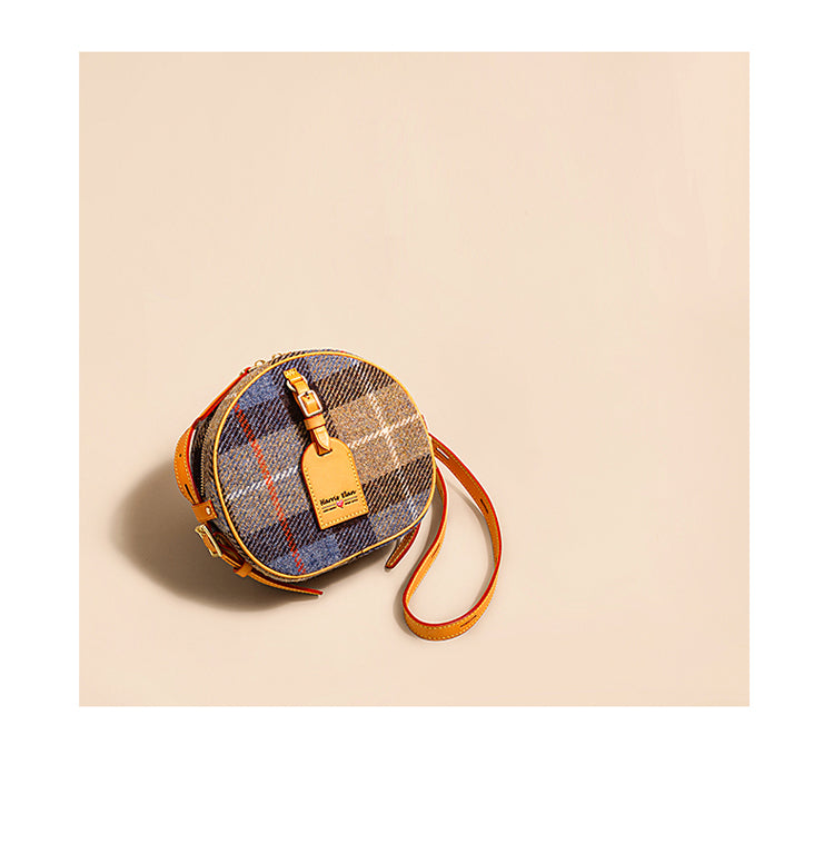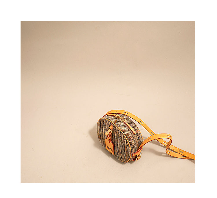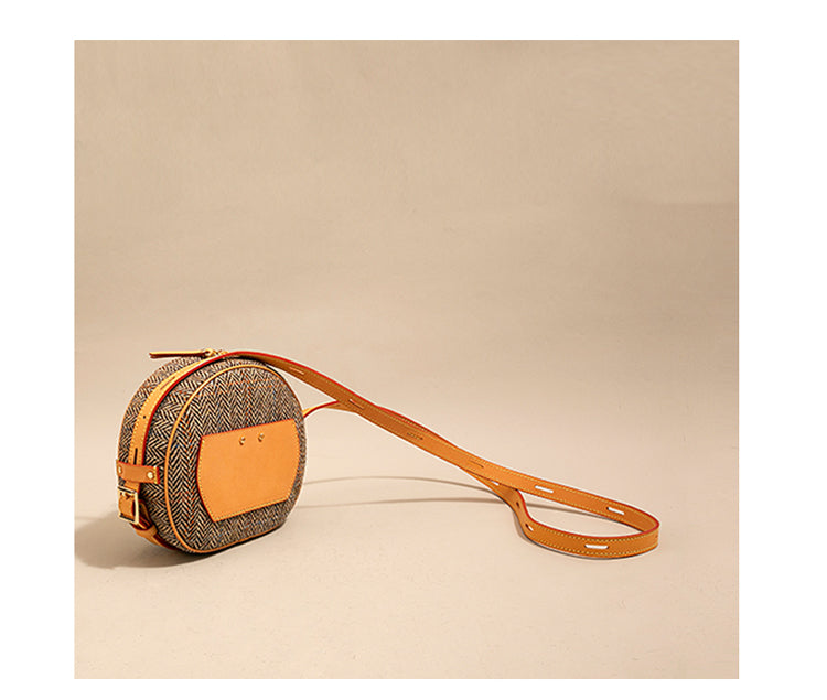 Design: Cute Womens Small Yellow Leather Tweed Round Crossbody Purse Handmade Round Shoulder Bag for Women