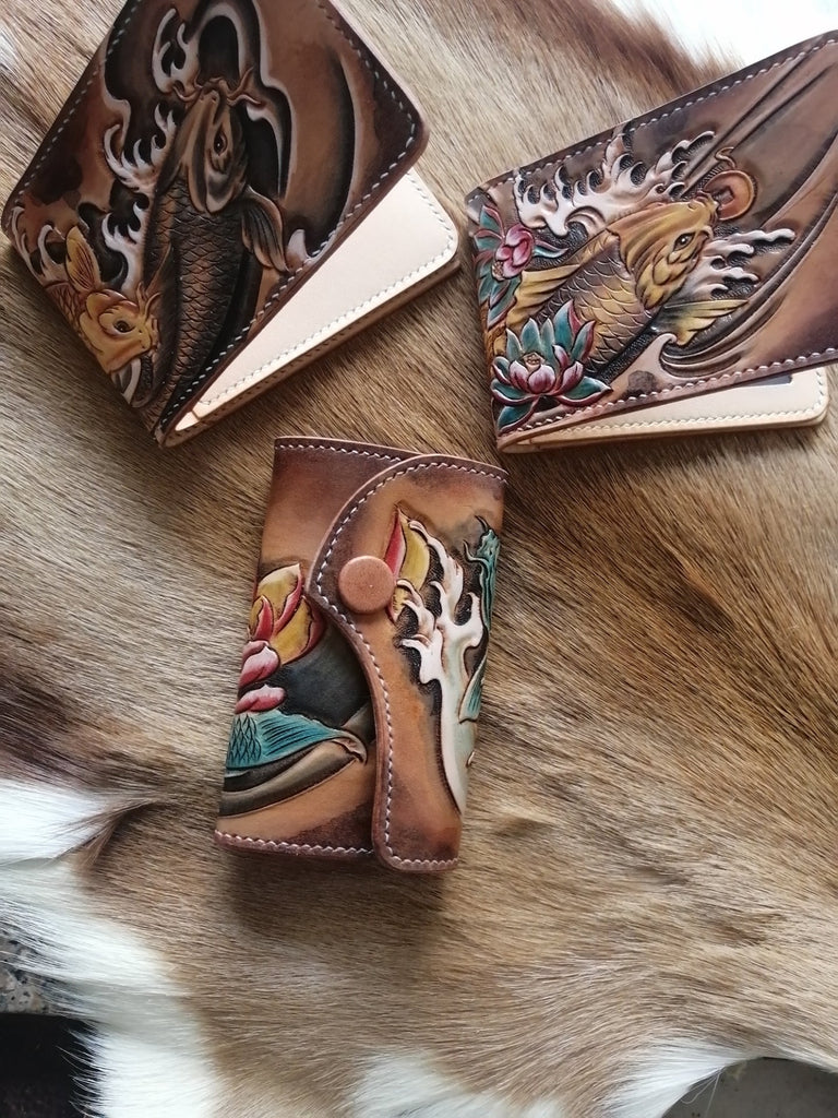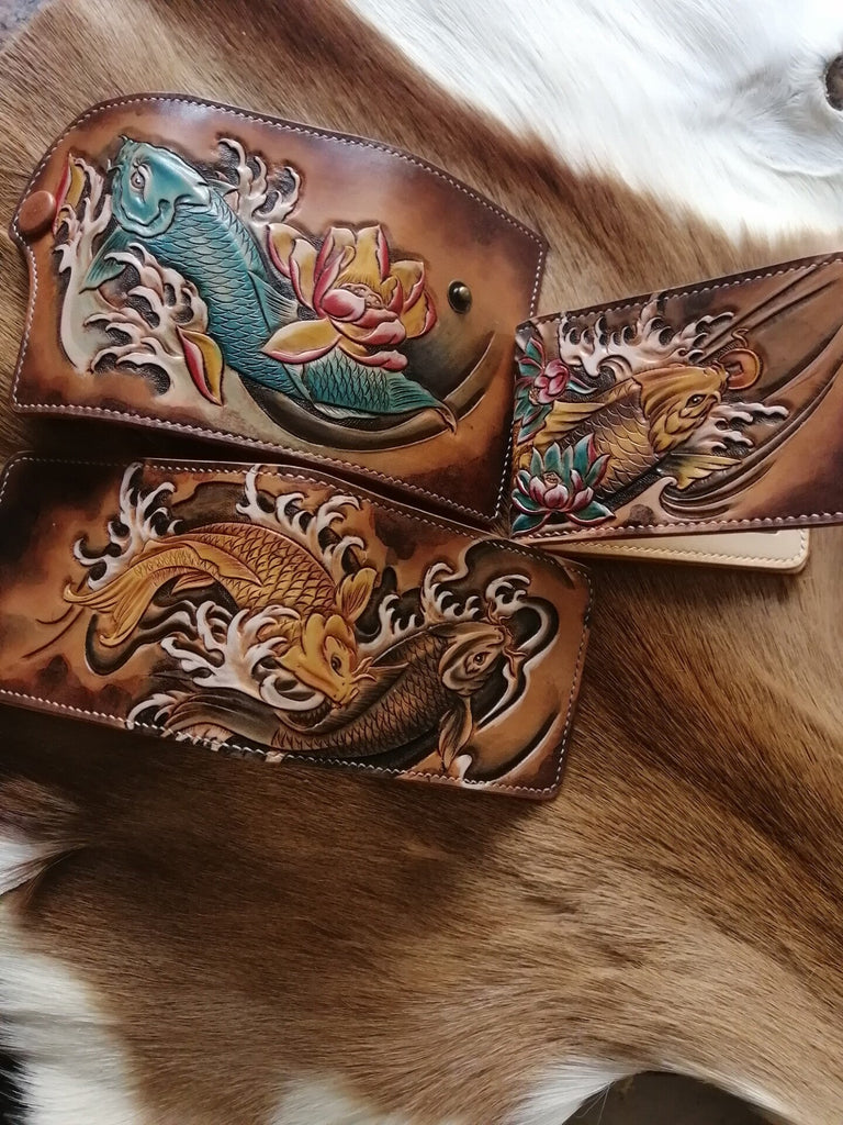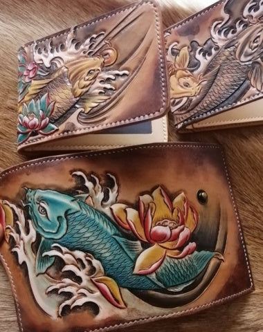 Design: Carp Tooled Leather Wallet Mens Wallet with ID Window Card Wallet with ID Window