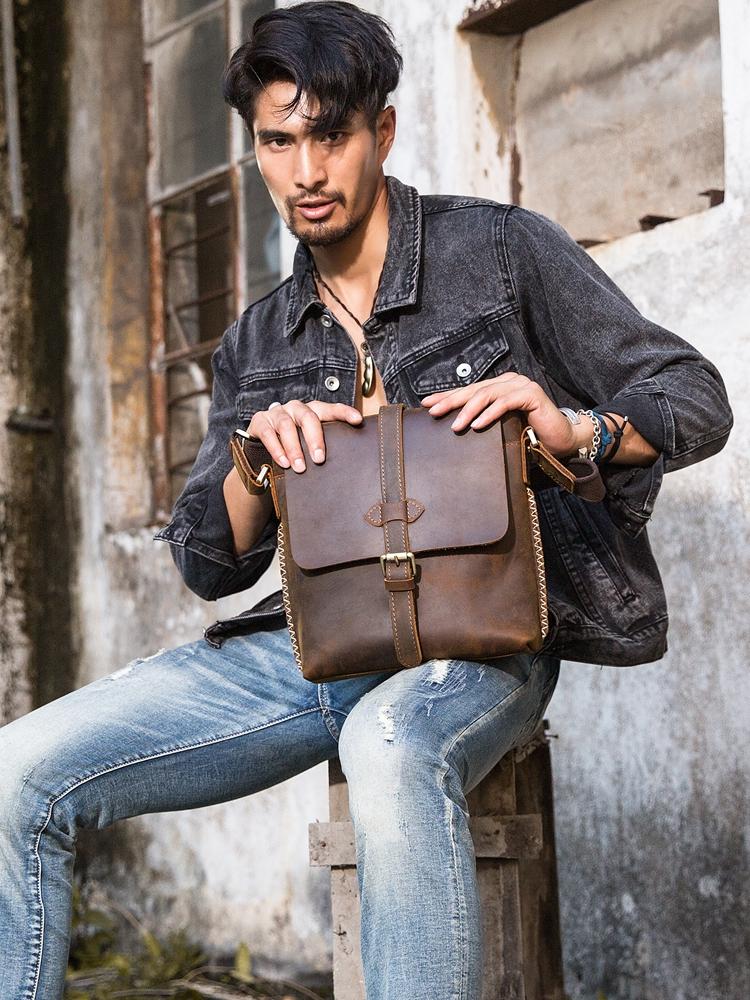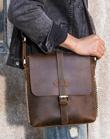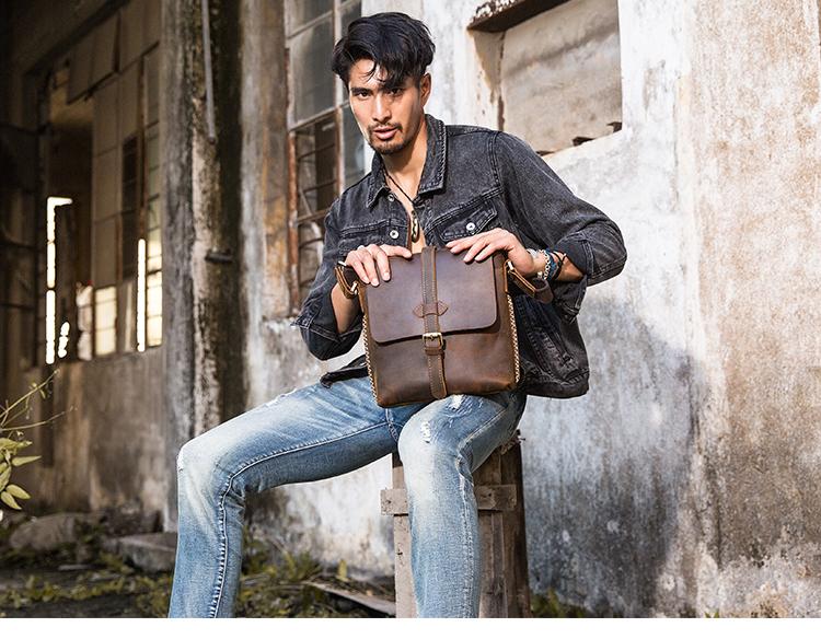 Style: Dark Brown Casual Leather Mens 10 inches Side Bag Postman Bag Black Messenger Bag Courier Bag for Men