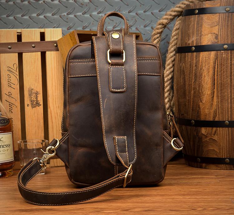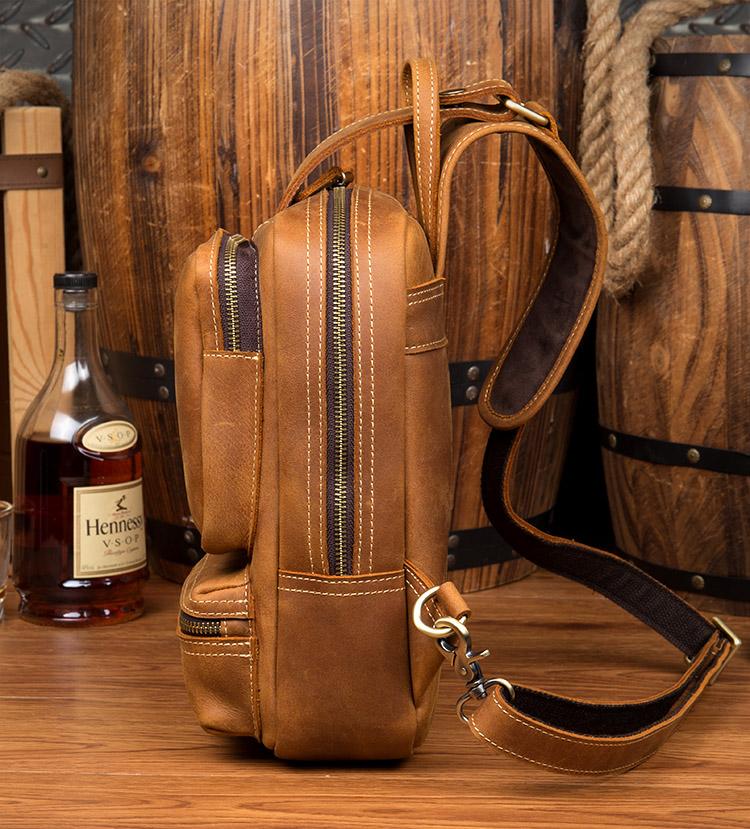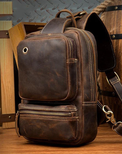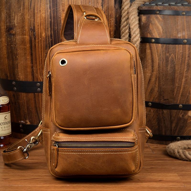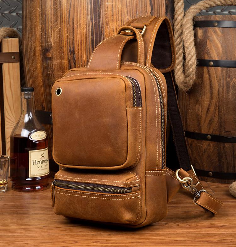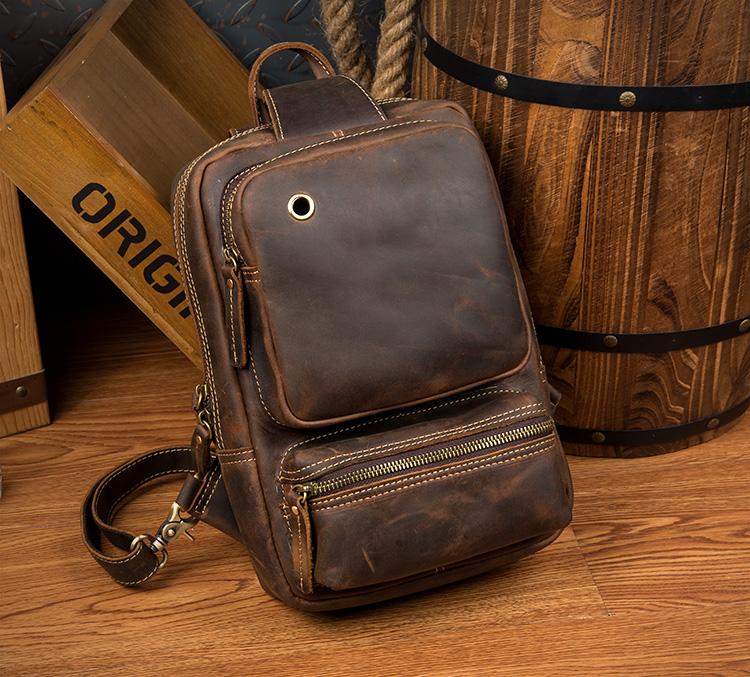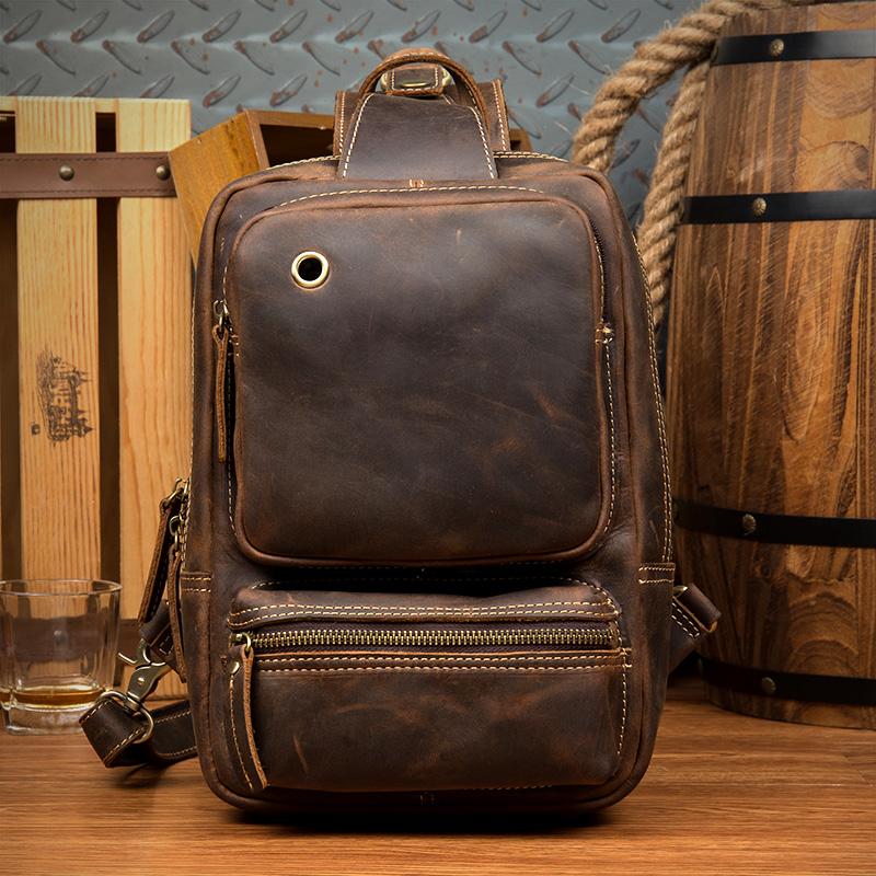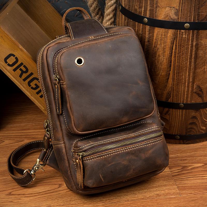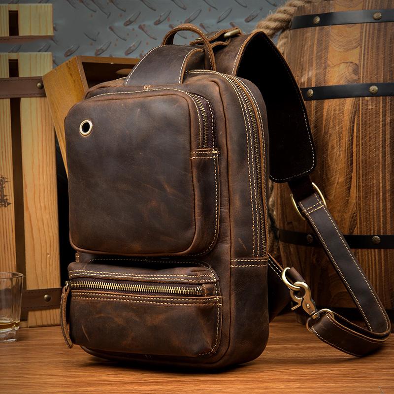 Casual Brown Mens Leather Large Sling Bag One Shoulder Pack Chest Bag Sling Backpack for men