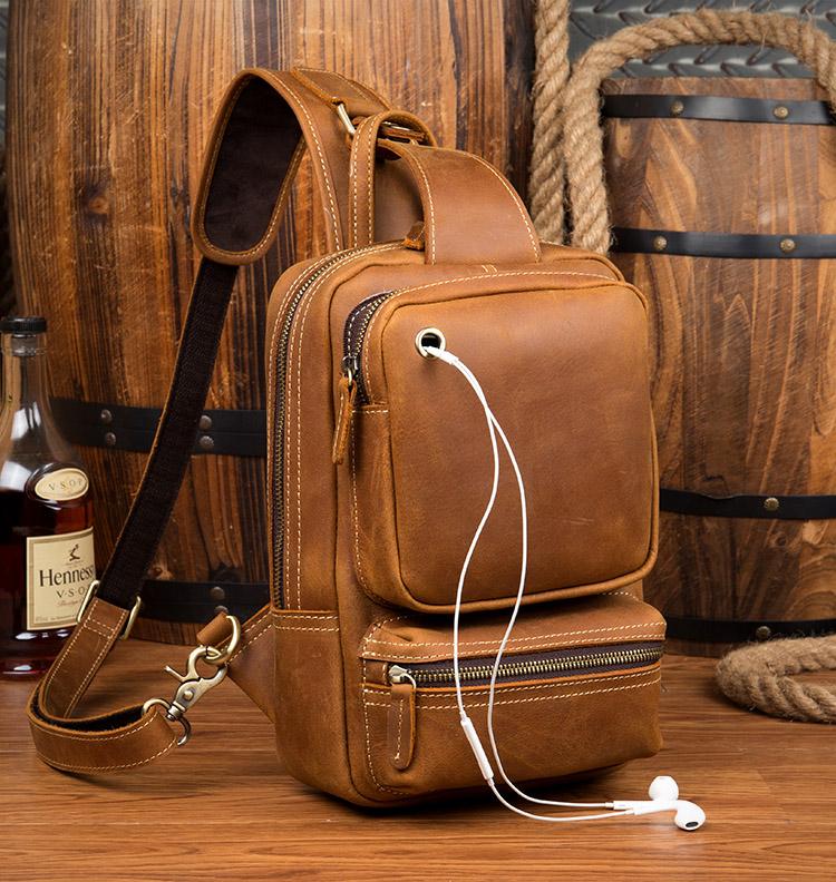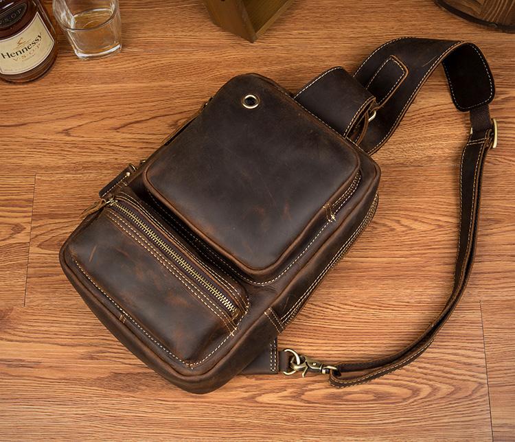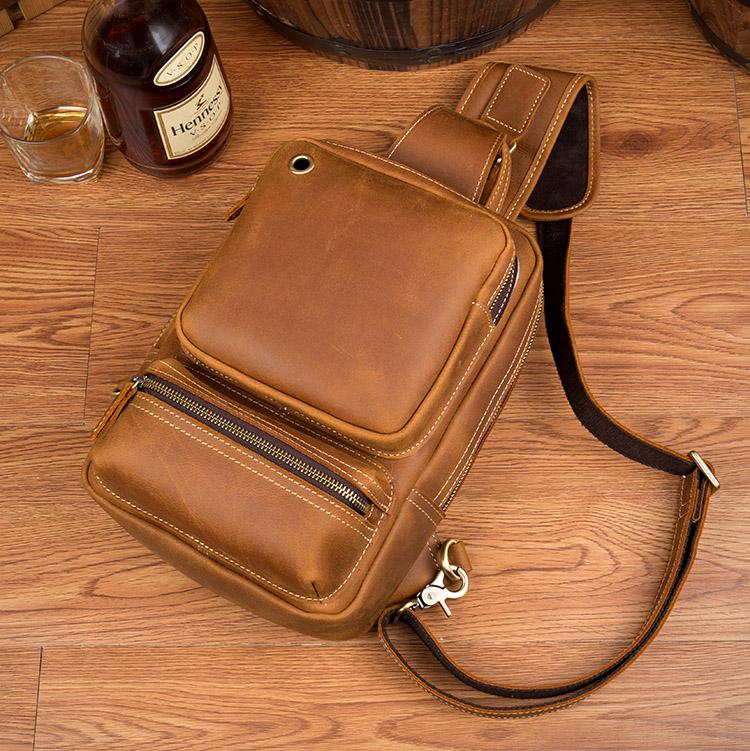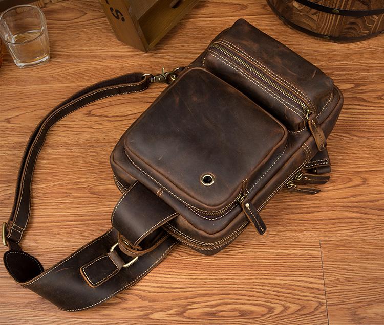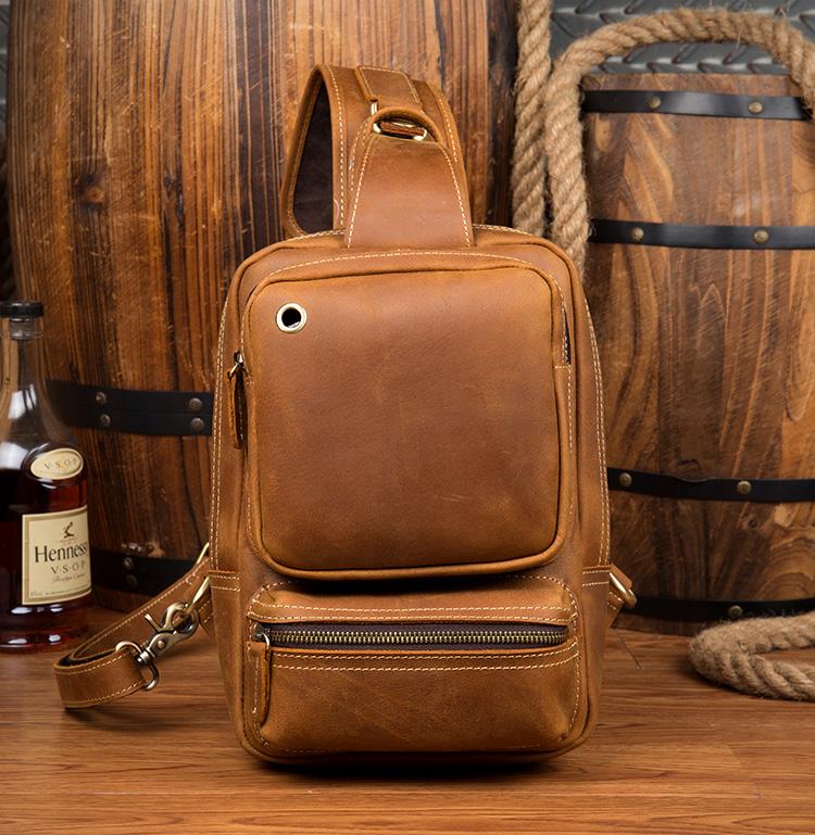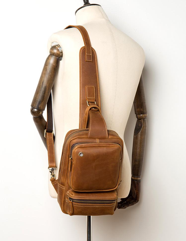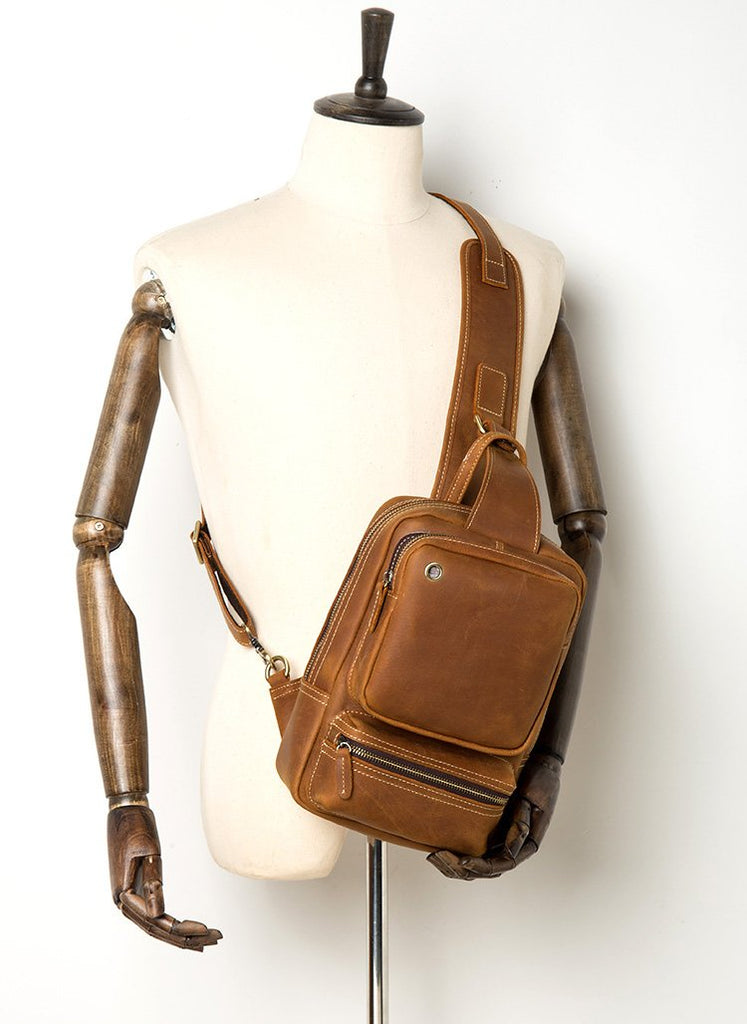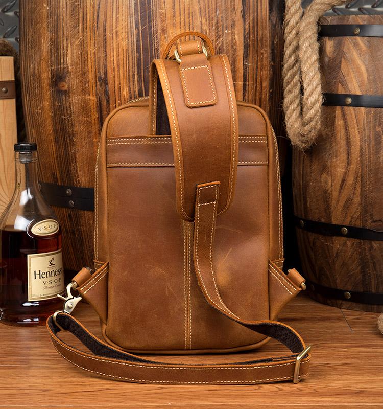 Casual Brown Mens Leather Large Sling Bag One Shoulder Pack Chest Bag Sling Backpack for men
