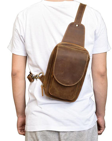 Design: Dark Brown Leather Men's 8 inches Brown Sling Bag Chest Bag One Shoulder Backpack For Men