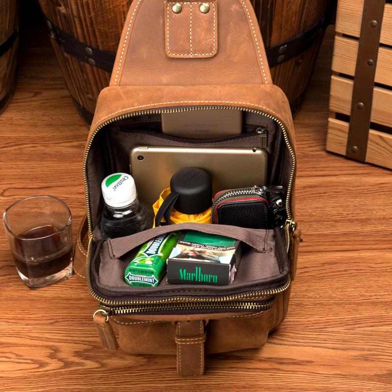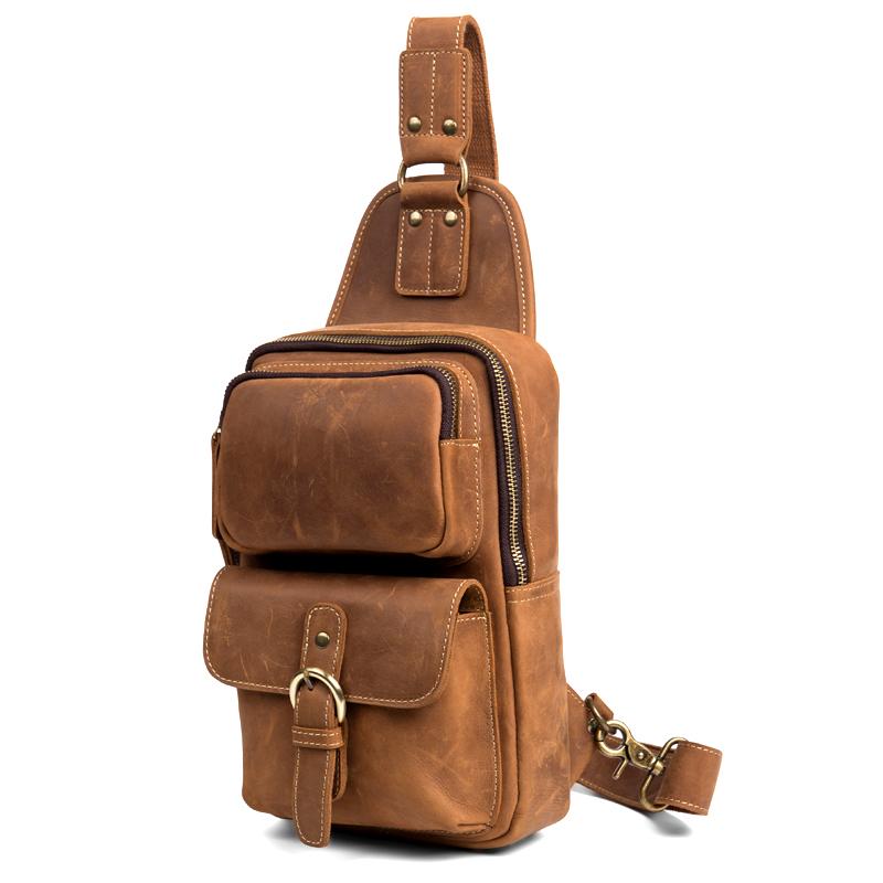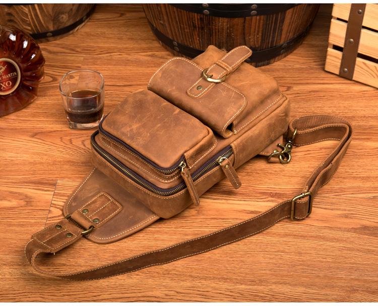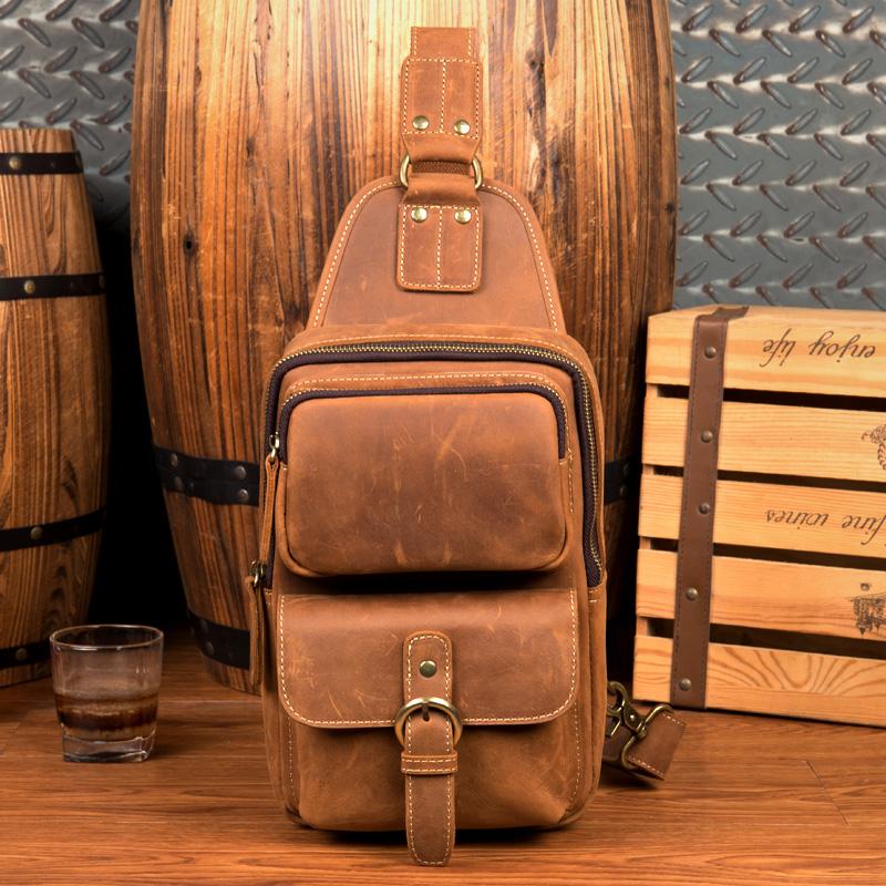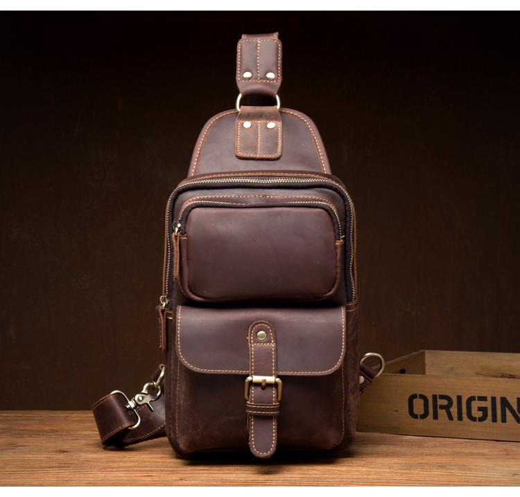 Design: Dark Brown Leather Mens Cool 10 inches Sling Bag Crossbody Bag Brown Chest Bag for men
