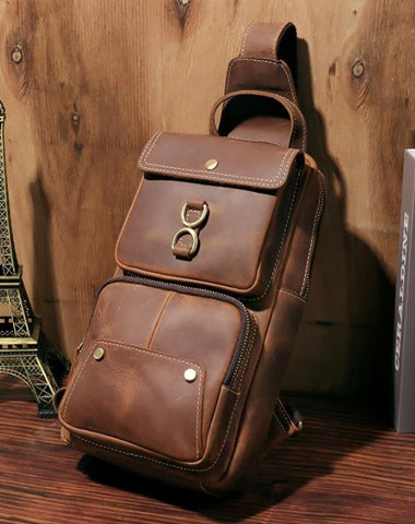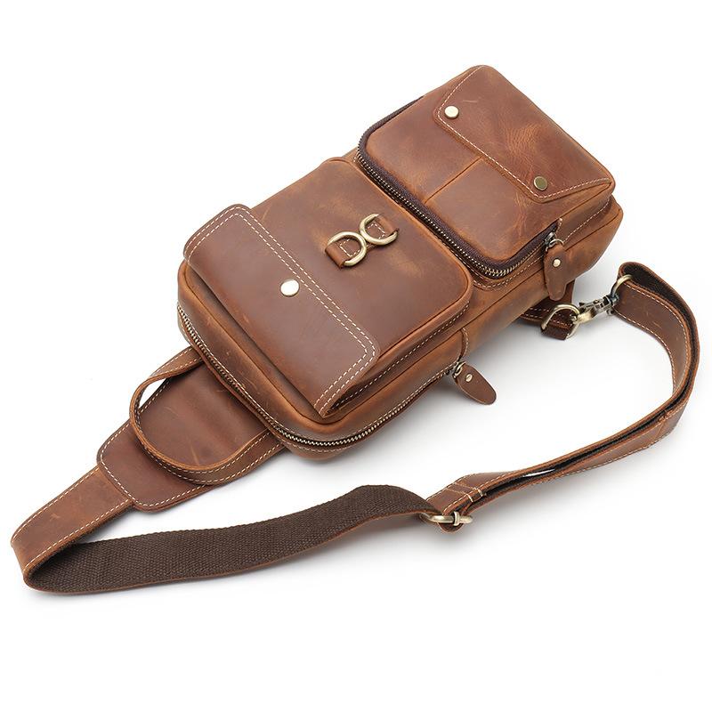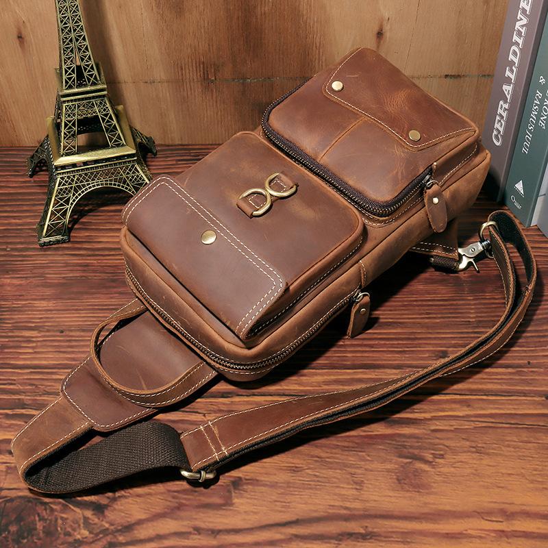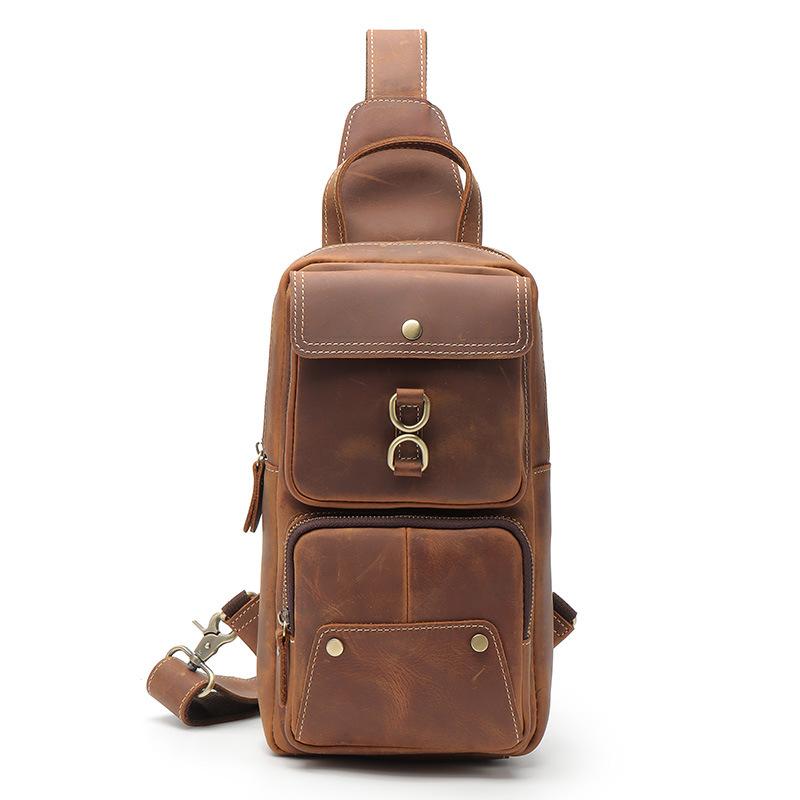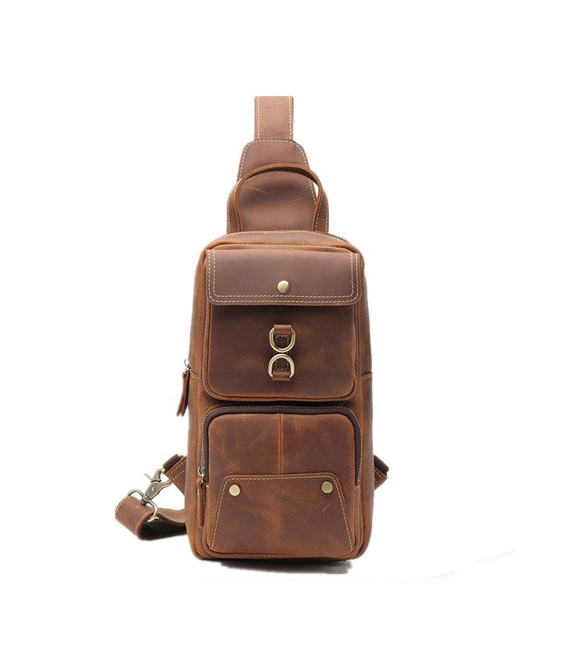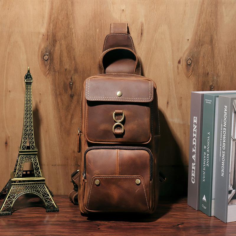 Design: Dark Brown Leather Men's Sling Bag Brown Chest Bags One Shoulder Backpack For Men