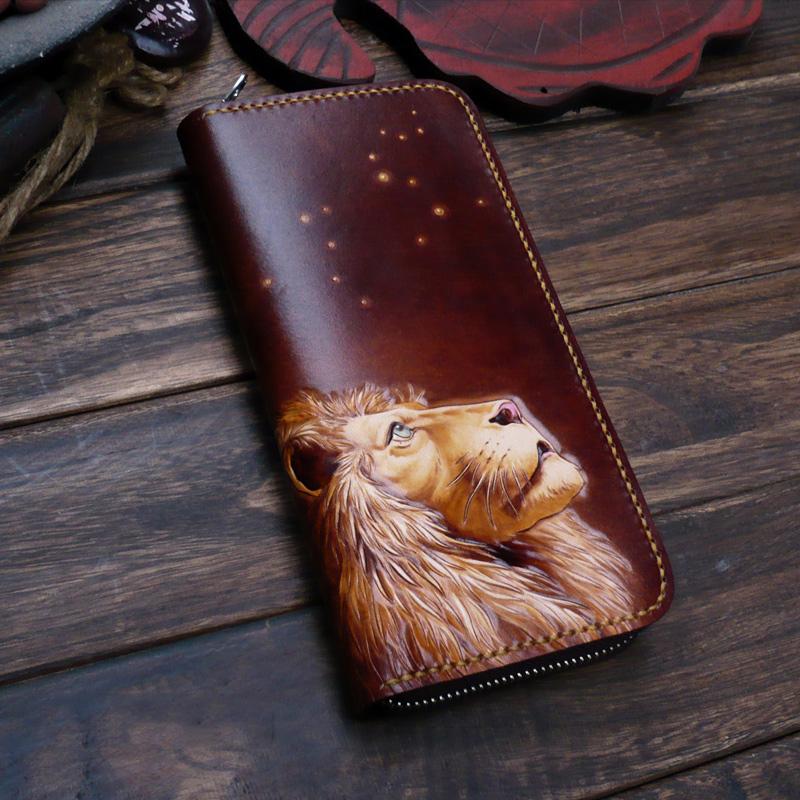 Design: Dark Coffee Handmade Tooled Lion Leather Mens Bifold Long Wallet Zipper Clutch For Men
