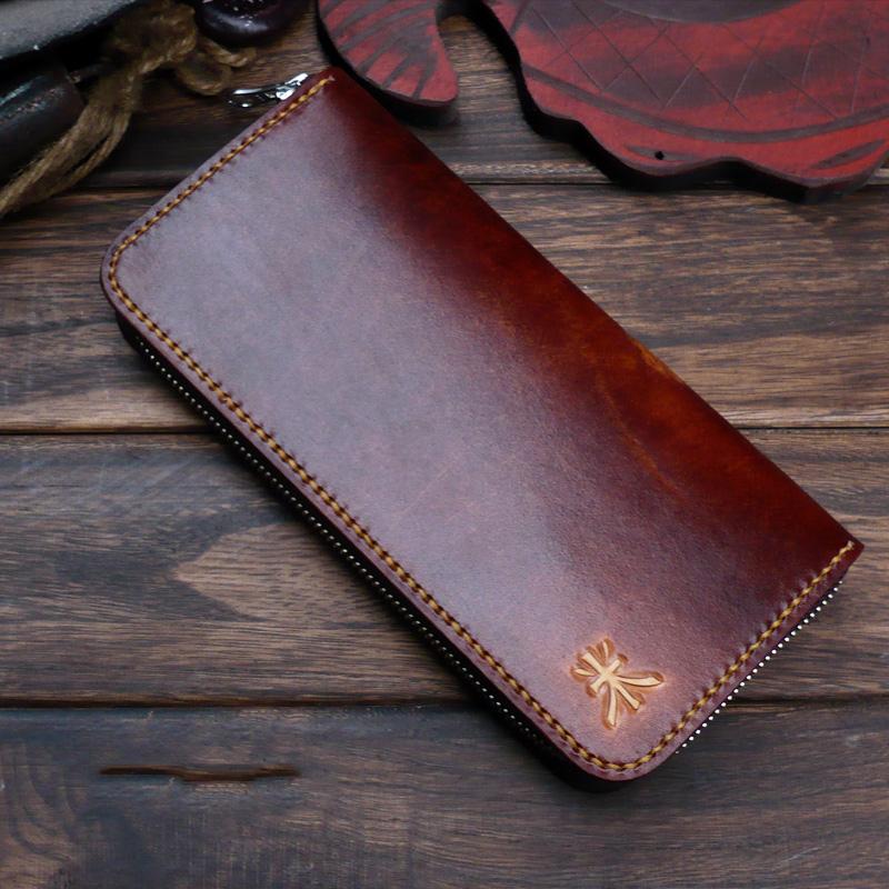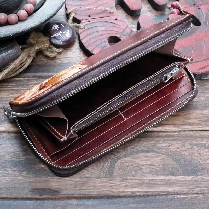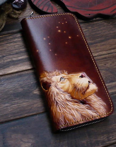 Style: Dark Coffee Handmade Tooled Lion Leather Mens Bifold Long Wallet Zipper Clutch For Men