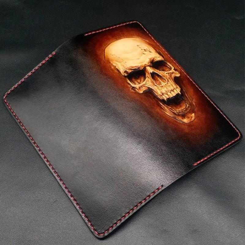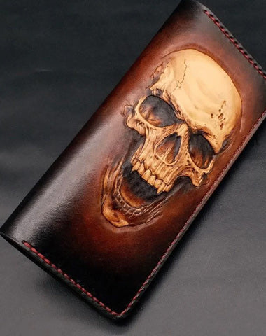 Style: Dark Coffee Handmade Tooled Smiling Skull Leather Mens Bifold Long Wallet Clutch For Men