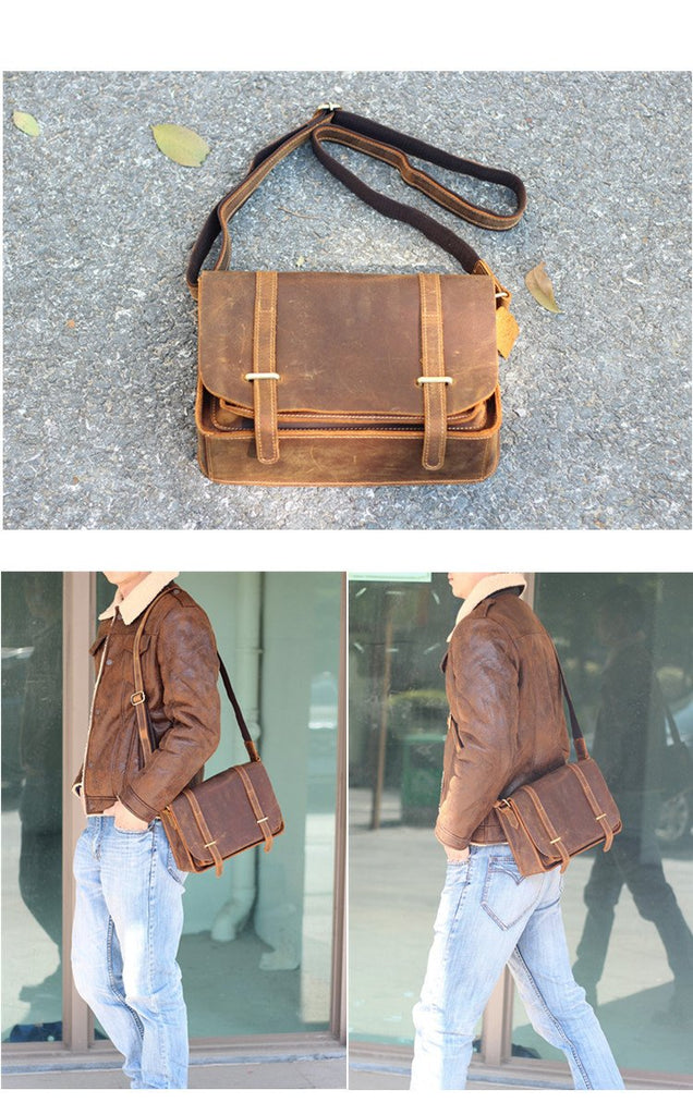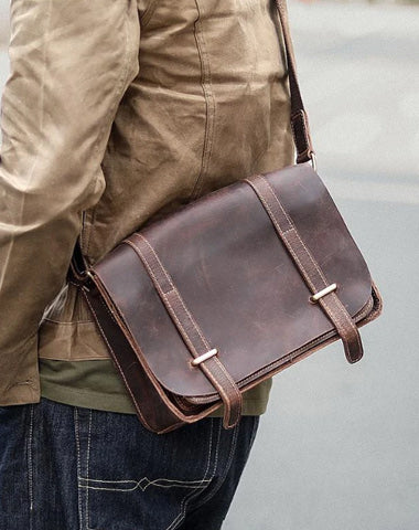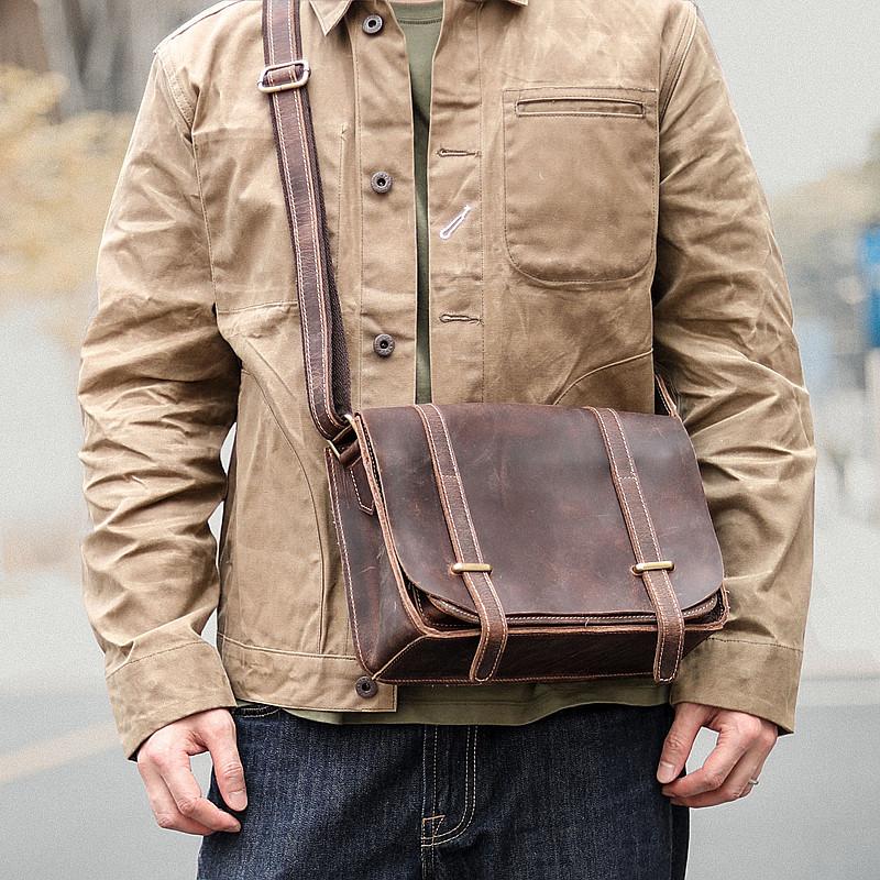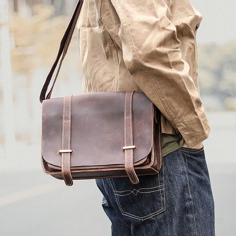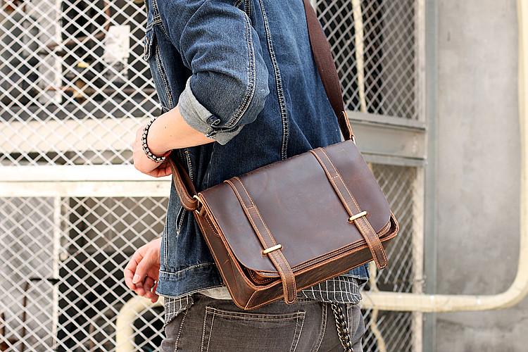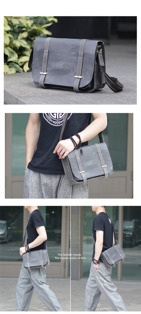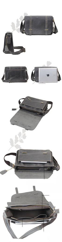 Design: Dark Gray Leather Mens Casual 10" Courier Bags Messenger Bag Dark Brown Postman Bag For Men