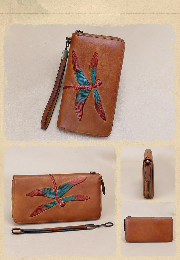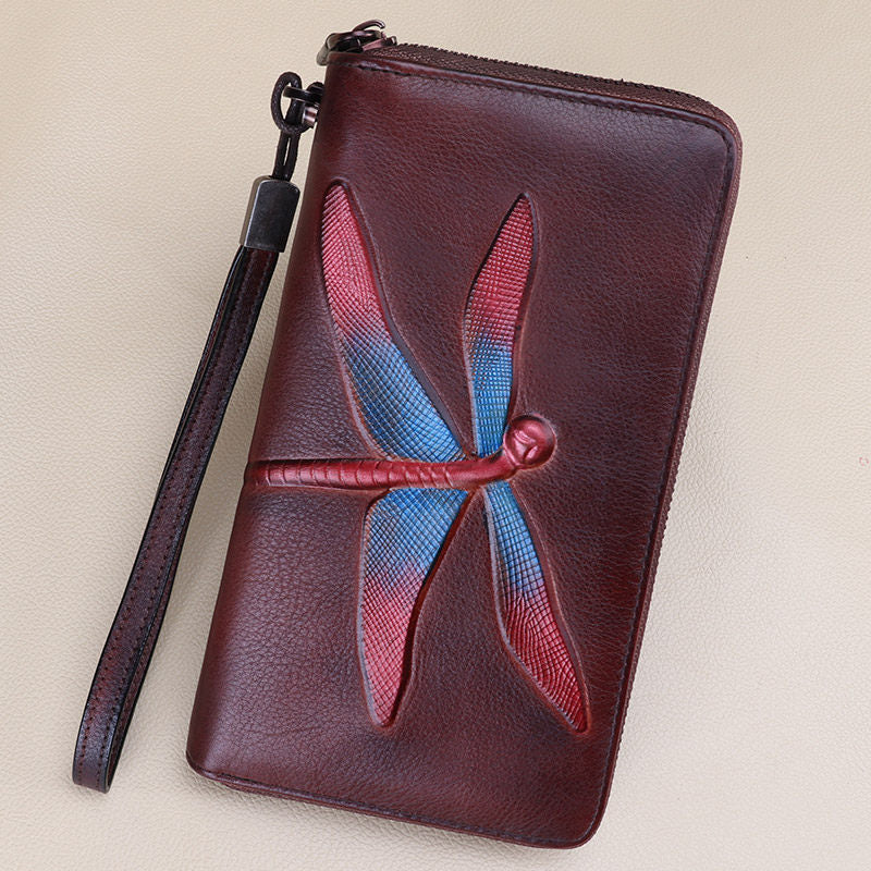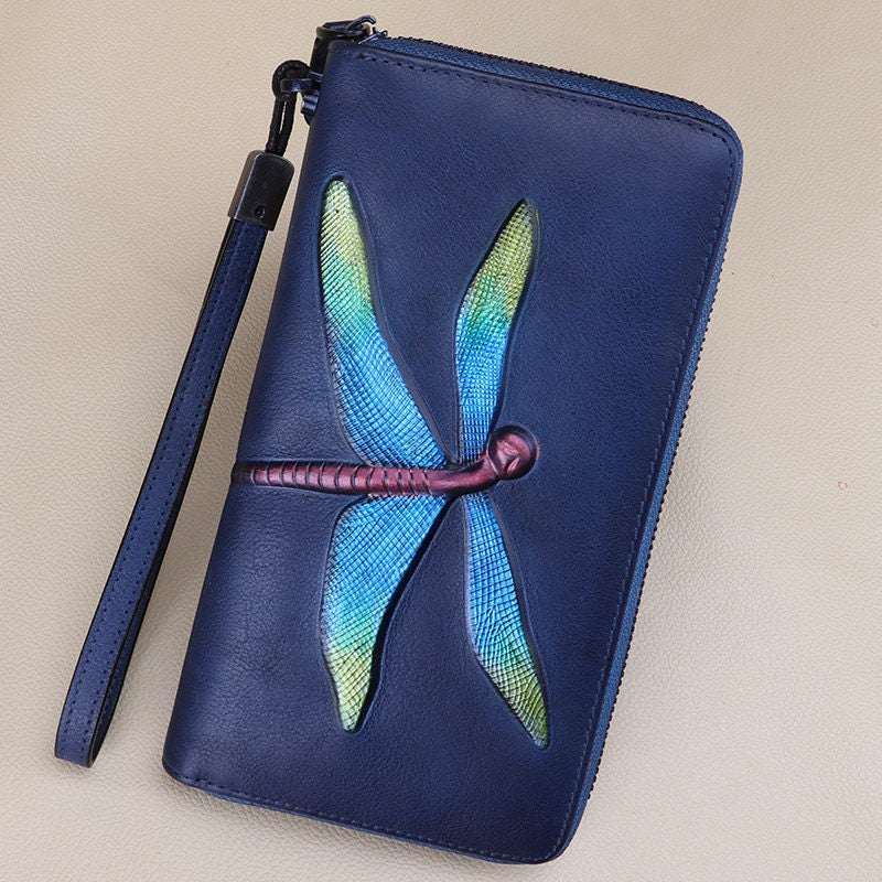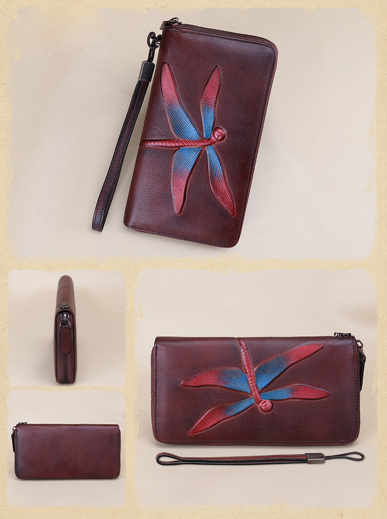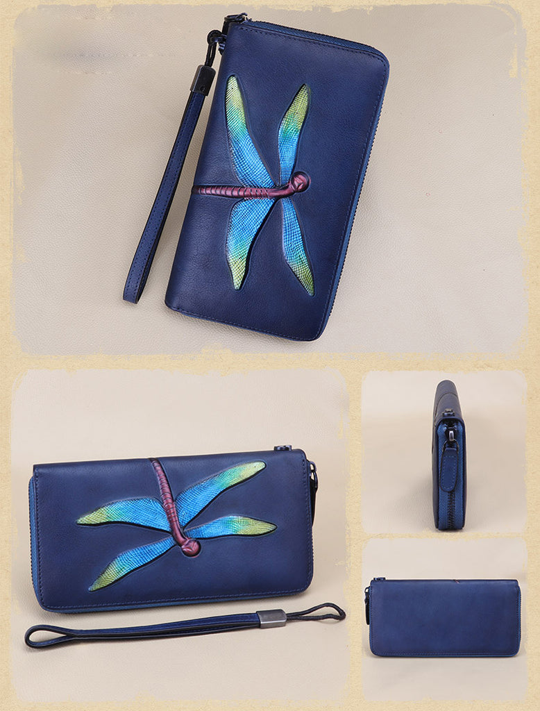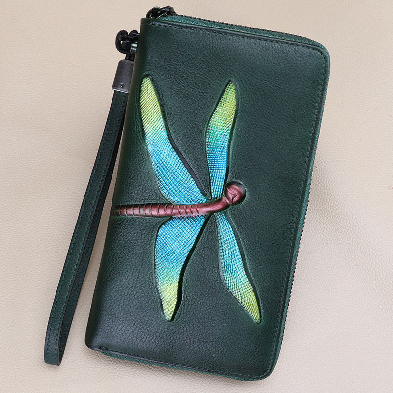 Style: Dragonfly Gray Leather Wristlet Wallets Womens Zip Around Wallet Ladies Zipper Clutch Wallets for Women