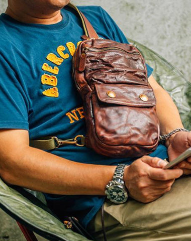 Design: Fashion Black Leather Men Army Green Chest Bag Messenger Bag One Shoulder Backpack For Men