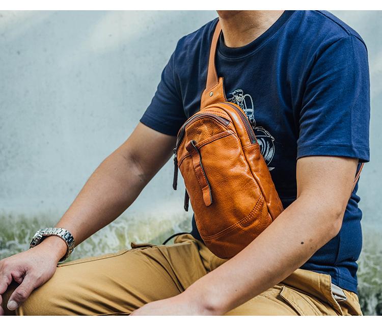 Design: Fashion Brown Leather Men Small Chest Bag Messenger Bag One Shoulder Backpack For Men