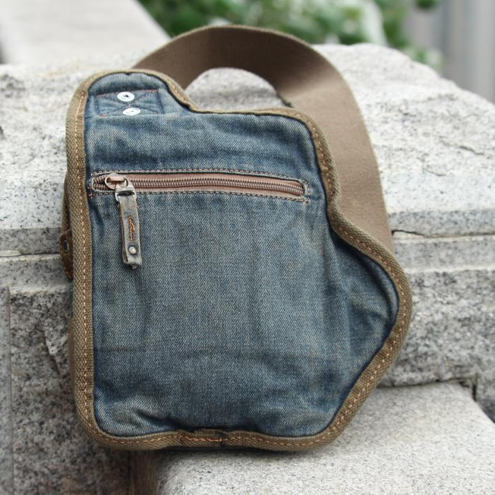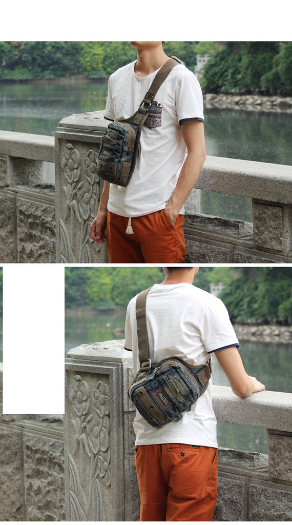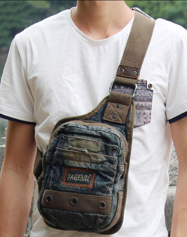 Style: Fashion Jean Blue Mens 8 inches Sling Bag Chest Bags Blue Denim One Shoulder Backpacks For Men