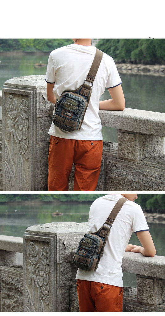 Design: Fashion Jean Blue Mens 8 inches Sling Bag Chest Bags Blue Denim One Shoulder Backpacks For Men