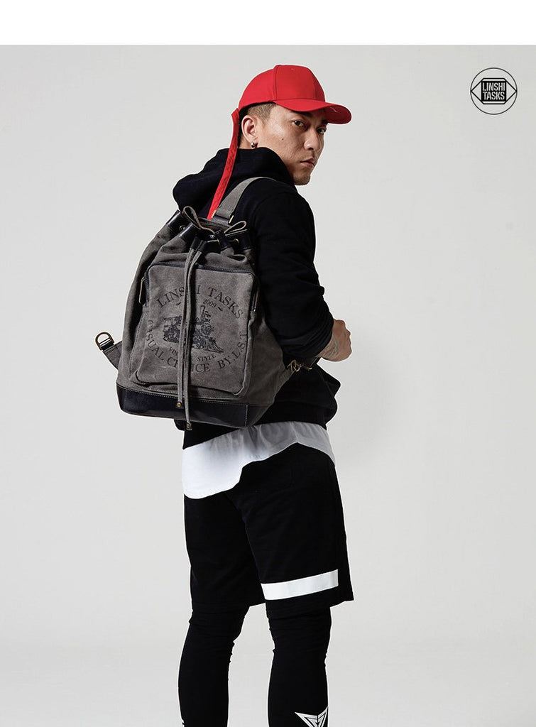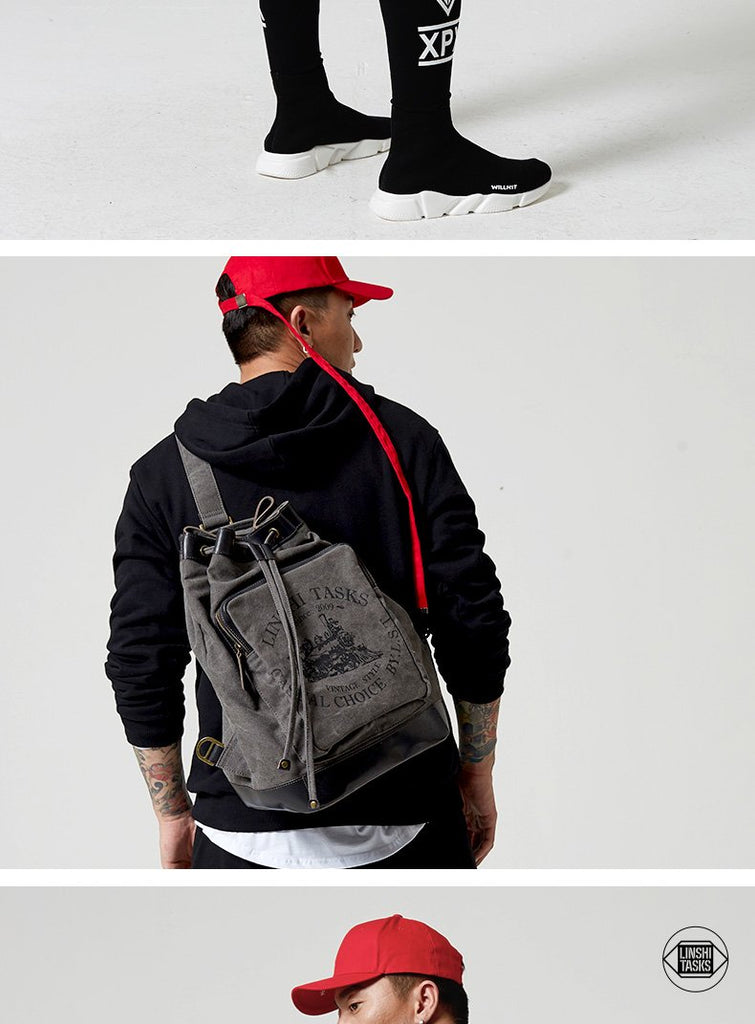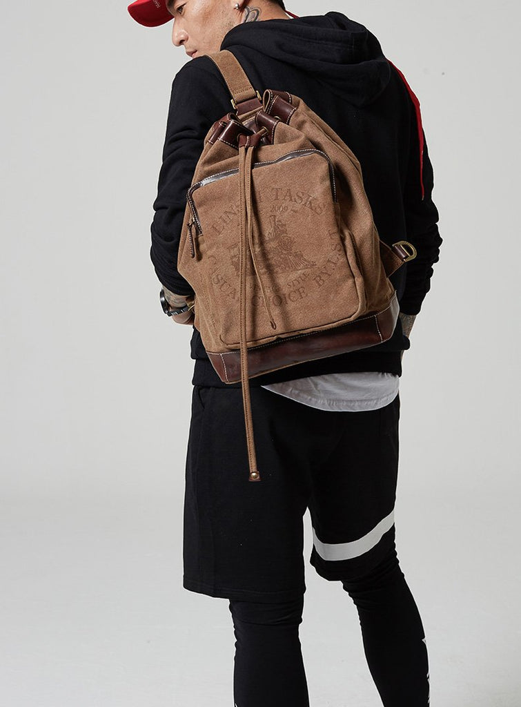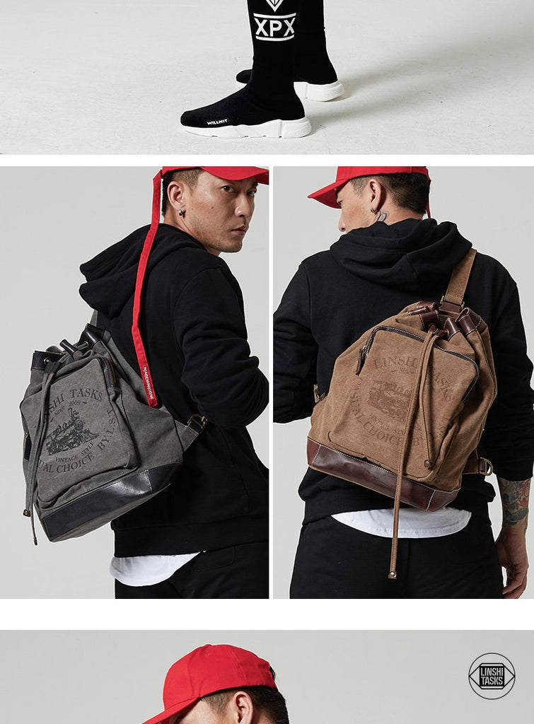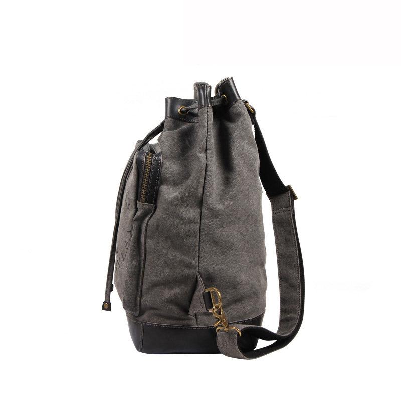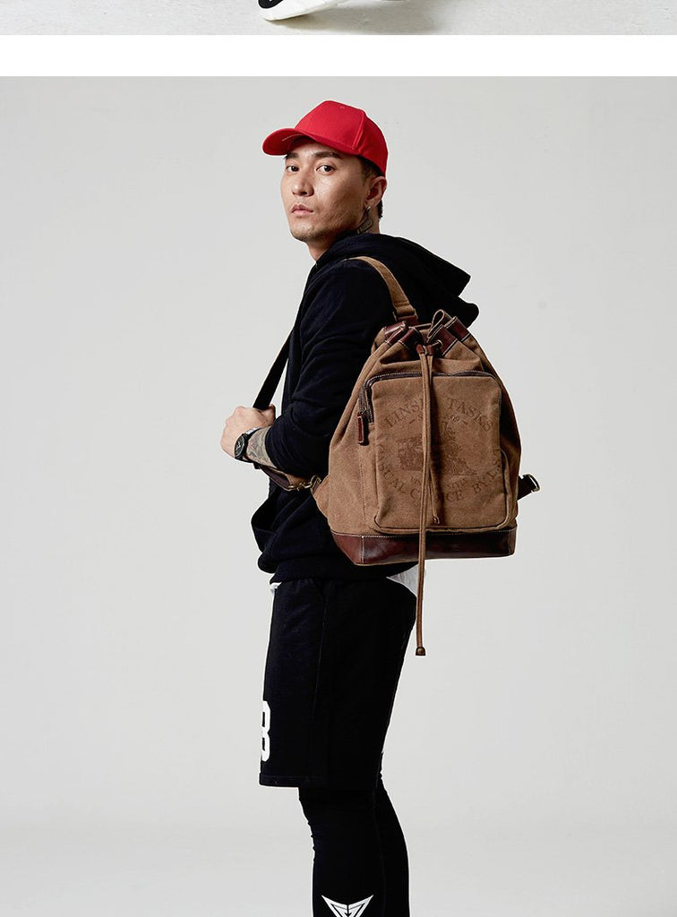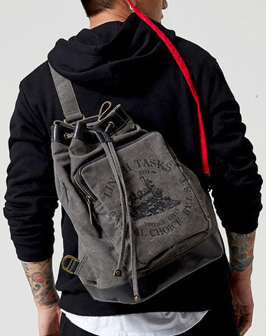 Style: Fashion Canvas Leather Mens Bucket Sling Bag Sling Pack Khaki Canvas Sling Backpack for Men