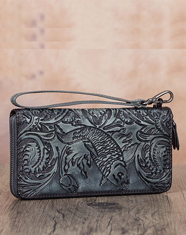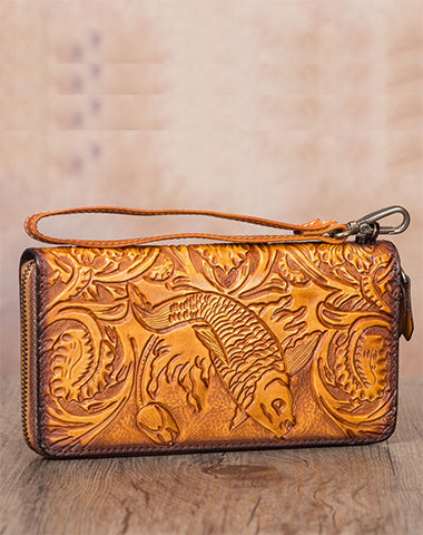 Style: Floral Carp Brown Leather Wristlet Wallets Womens Zip Around Wallet Floral Ladies Zipper Clutch Wallets for Women