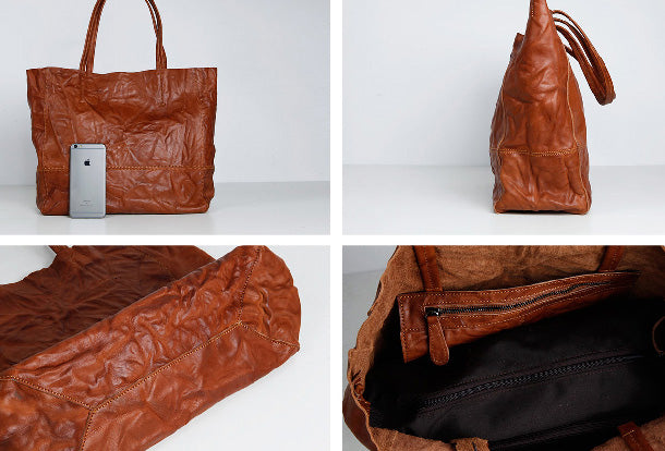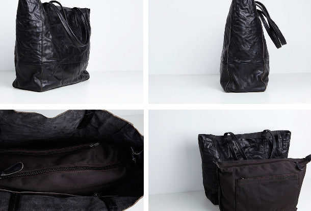 Design: Genuine Leather Black Brown Handbag Large Tote Bag Wrinkled Shopper Bag Shoulder Bag Purse For Women