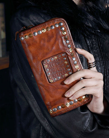 Design: Genuine Leather Mens Cool Long Leather Wallet Biker Wallet Zipper Clutch Wristlet Wallet for Men