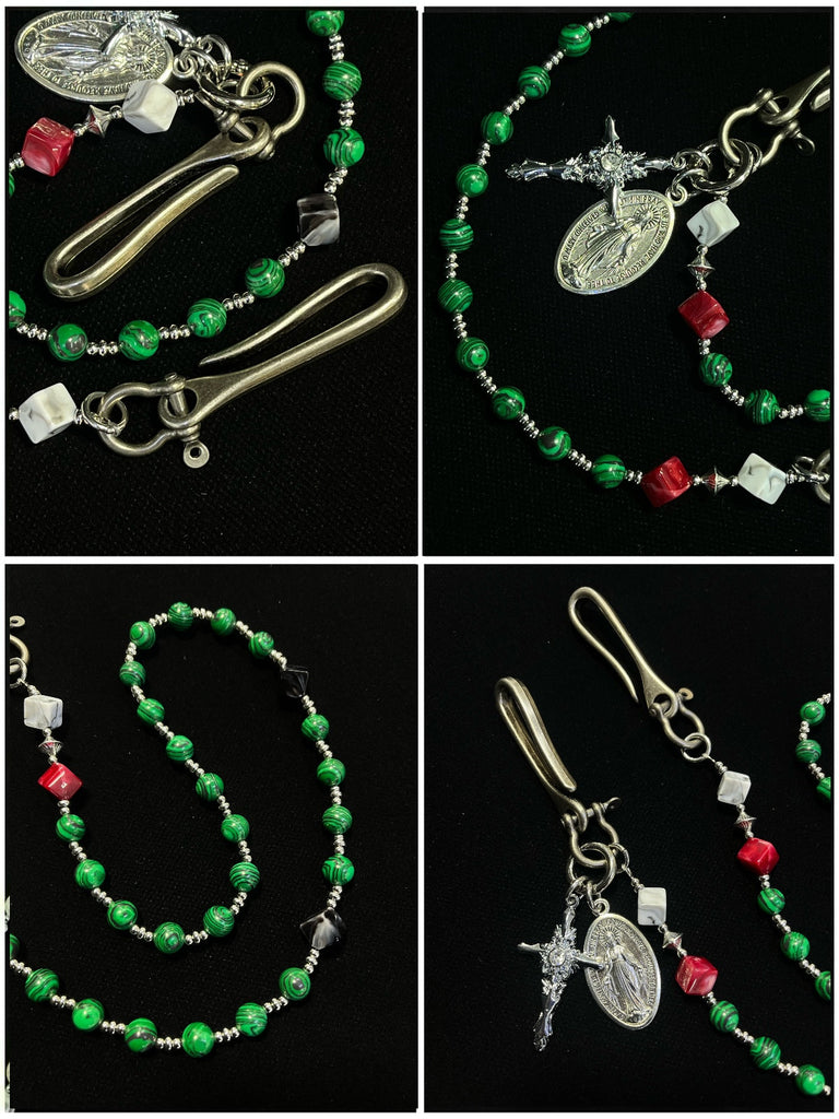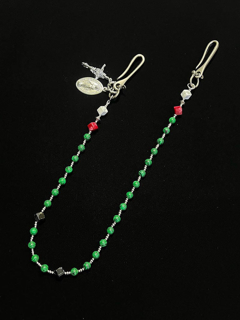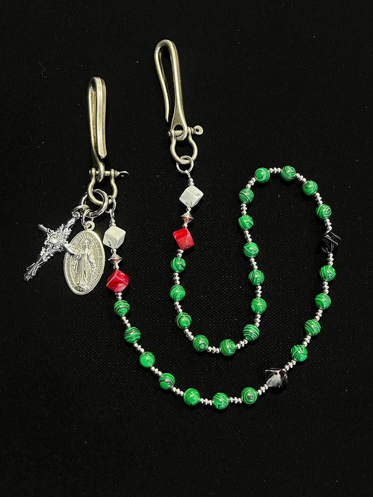 Discover a truly distinctive accessory with our eye-catching beaded Wallet Chain, where natural elegance meets spiritual symbolism. This 78cm chain features striking green striped stone beads, carefully selected for their unique patterns and vibrant color, complemented by sleek silver-toned hooks and clasps. The chain is finished with a meaningful combination of a cross pendant and a Saint Benedict Medal near the fastening end, creating a layered spiritual statement. This exceptional beaded pants chain offers a perfect balance of organic beauty and symbolic depth, making it a standout piece for those who value both style and meaning.