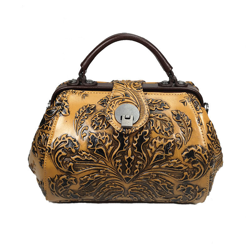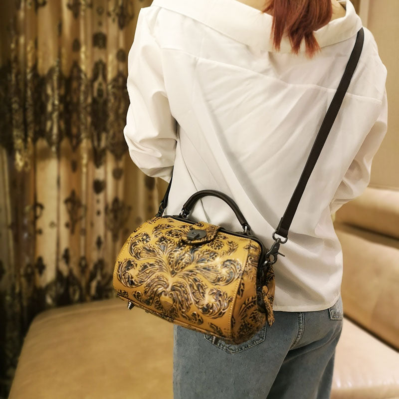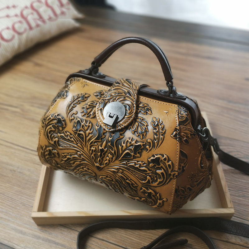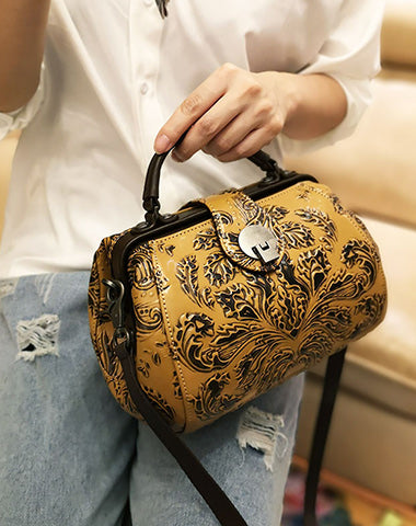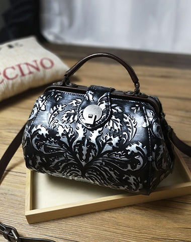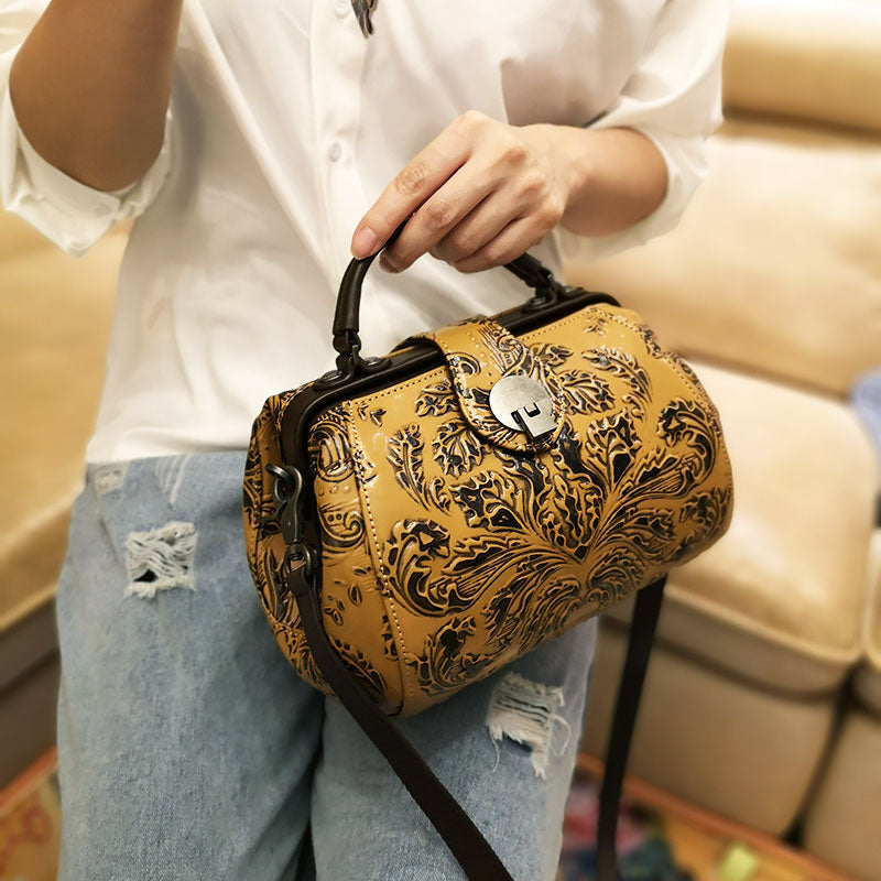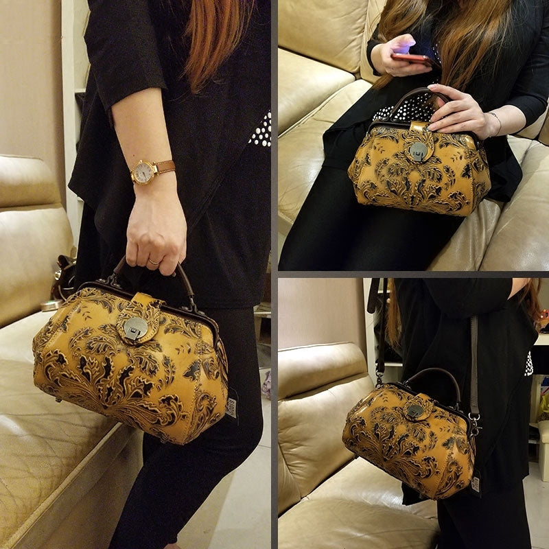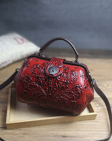 Style: Handamde Womens Red Leather Doctor Handbag Purses Floral Red Doctor Crossbody Purse for Women