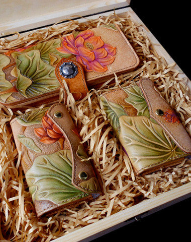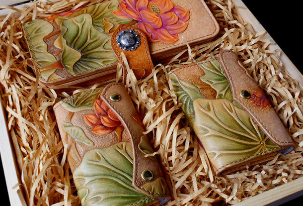 This is handcraft vintage ?hand painting lotus flower natural Italian Vegetable Tanned leather? hand dyed long/keys/card?wallet for women.The long wallet is bifold,color is beige.There are 6 full size bill slots/holders,12 ID/credit card slots/holders~There are ?2 keys holder in keys wallet and 40 card holders in card wallet. Hand-made in the traditional method with punched holes and saddle stitching by hand.