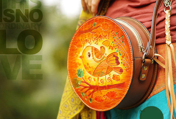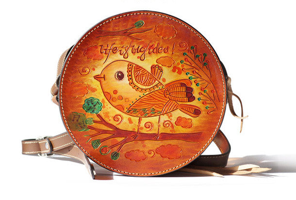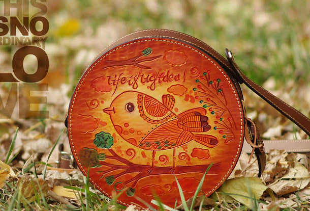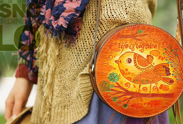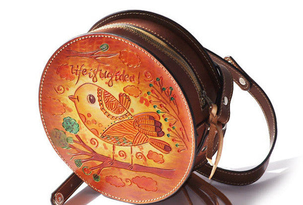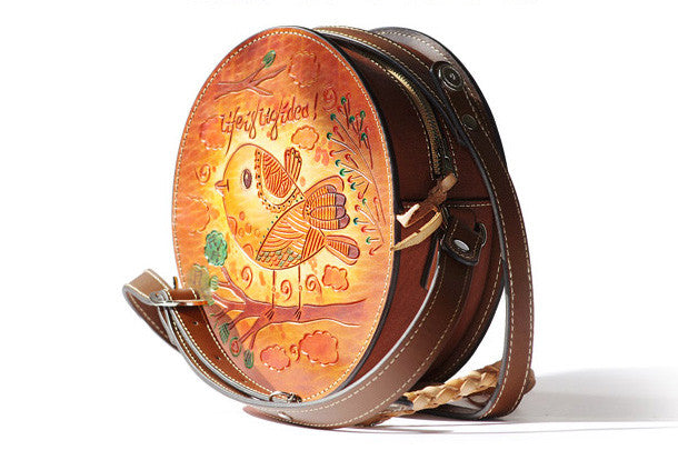 This is Handcraft retro crossbody leather floral round bird hand dyed shoulder big bag /handbag for women.The bag is hand dyed,carved.