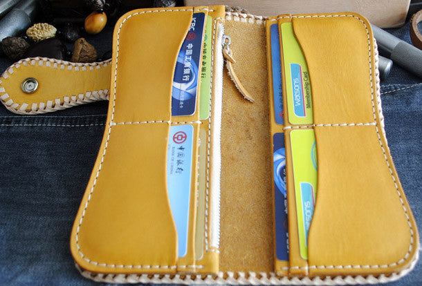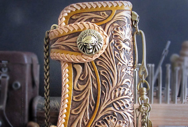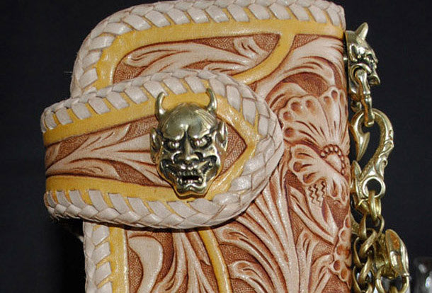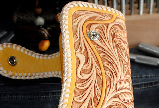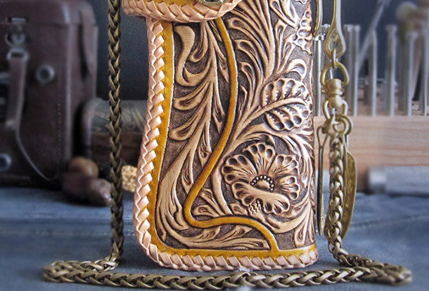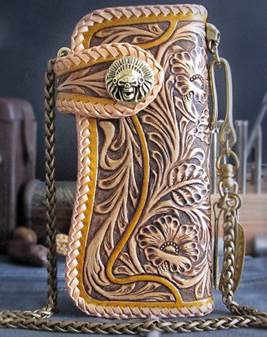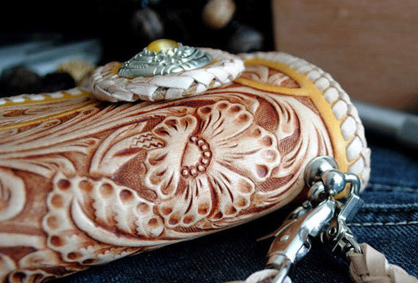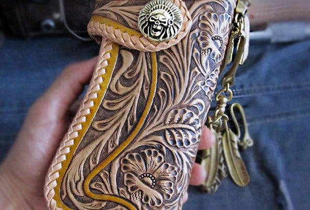 This is handmade beige brown natural Italian Vegetable Tanned leather long floral carved biker wallet purse clutch for men.The wallet is bifold,color is beige&brown.There are 2 full size bill slots/holders, 8 ID/credit card slots/holders,1 zip coin change slot~Hand-made in the traditional method with punched holes and saddle stitching by hand.