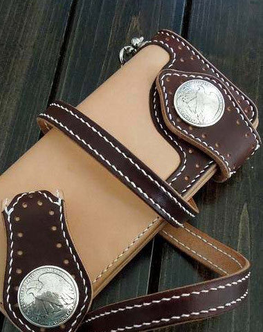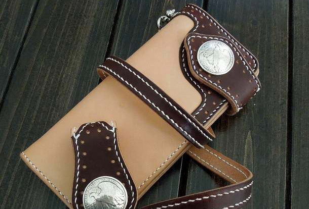 This is handmade natural Italian Vegetable Tanned leather ?beige coffee leather biker wallet chain bifold Long wallet purse for men.The wallet is bifold,color is beige&coffee.There are 3?full size bill slots/holders,10 ID/credit card slots/holders,?1 zip coin slot/holder and a floral button /?vintage icon?as its lock catch~Hand-made in the traditional method with punched holes and saddle stitching by hand.